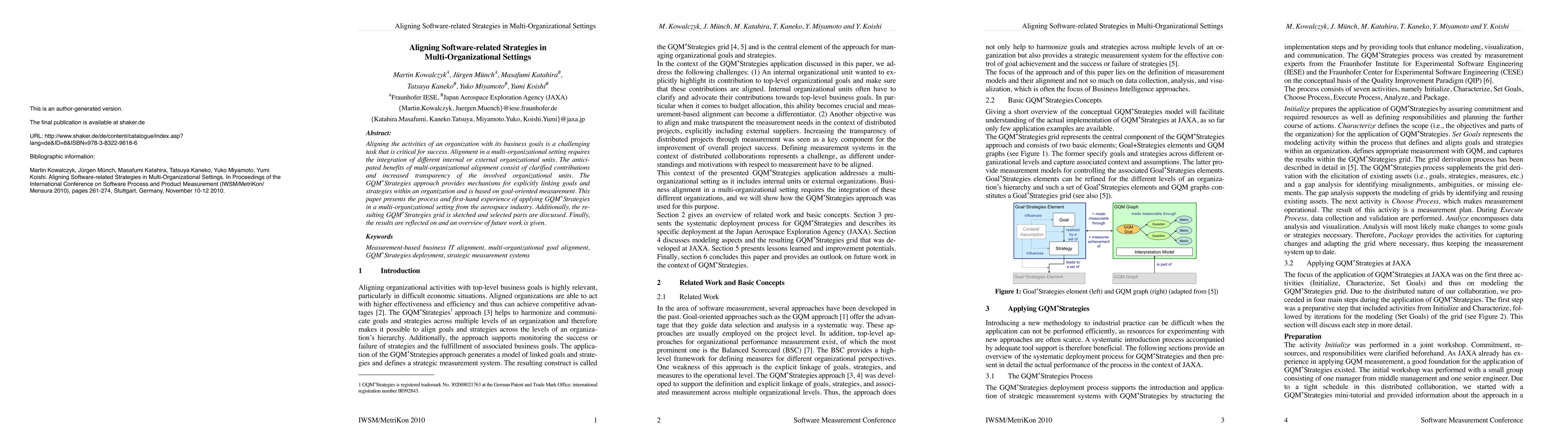 This paper explores the application of the GQM+Strategies approach to align software-related strategies across multiple organizations, emphasizing the benefits of increased transparency and clarity in contributions. Initial experiences from an aerospace industry case study are presented, along with a discussion of the resulting GQM+Strategies grid and future research directions.