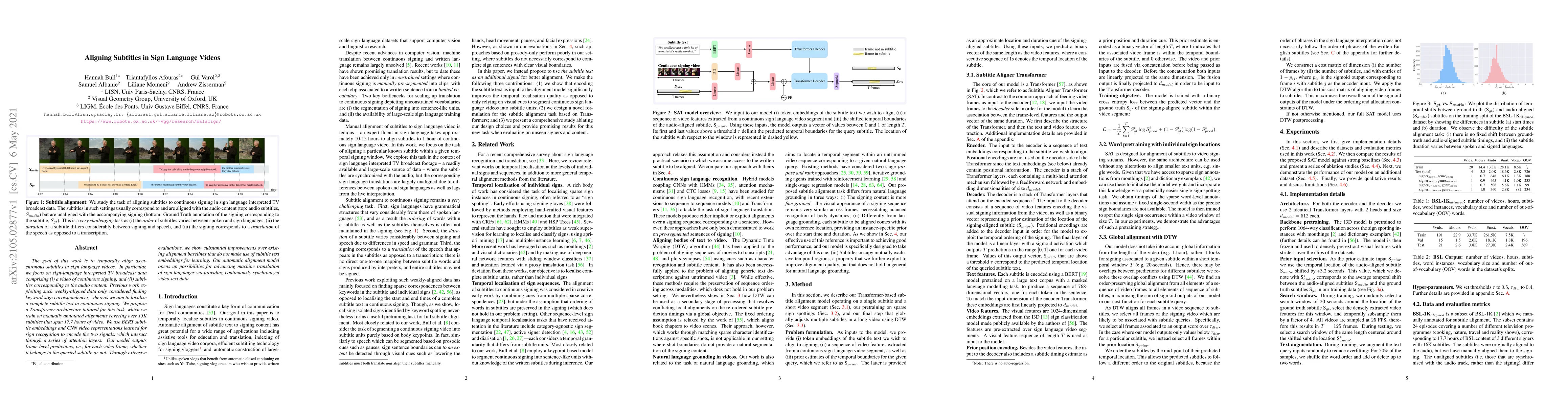 This paper proposes a Transformer architecture to temporally align asynchronous subtitles in sign language videos, using BERT and CNN to encode subtitles and video respectively. The model significantly outperforms existing methods, enabling better machine translation of sign languages through synchronized video-text data.