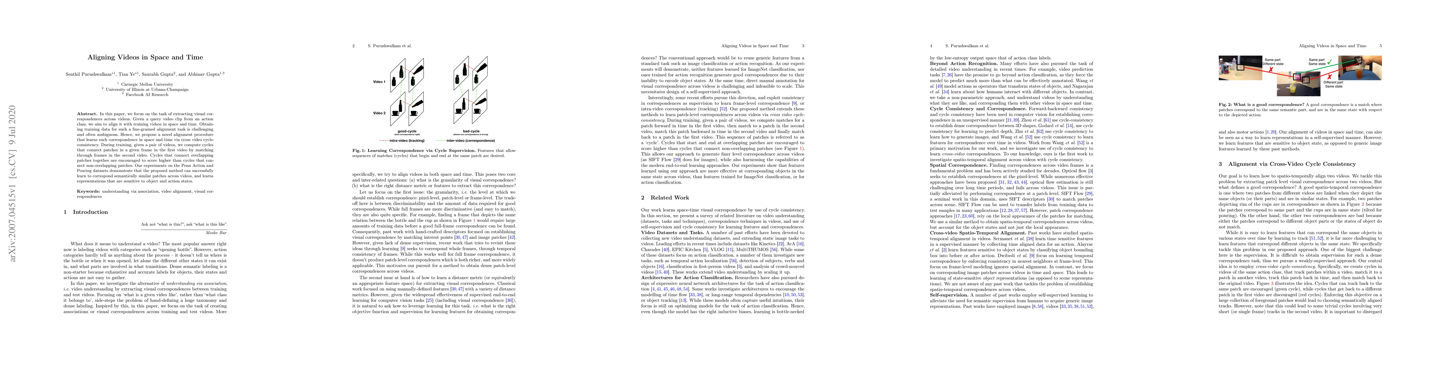 This research introduces a method to align video clips by learning spatial and temporal correspondences across videos. It uses cycle-consistency during training to connect patches in a frame of one video to another, favoring overlap. The method successfully learns to correspond semantically similar patches across videos, as shown on Penn Action and Pouring datasets.