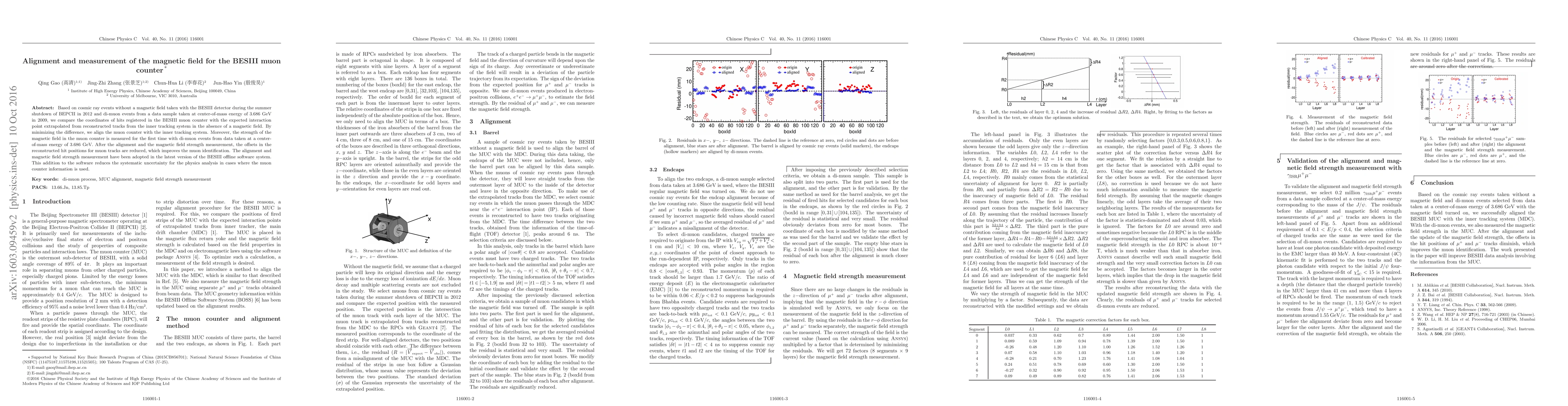 This paper details the alignment and measurement of the magnetic field for the BESIII muon counter using cosmic ray events and di-muon data. The alignment minimizes discrepancies between the muon counter and the inner tracking system, while the magnetic field strength is measured for the first time, improving muon identification and reducing systematic uncertainties in physics analysis.