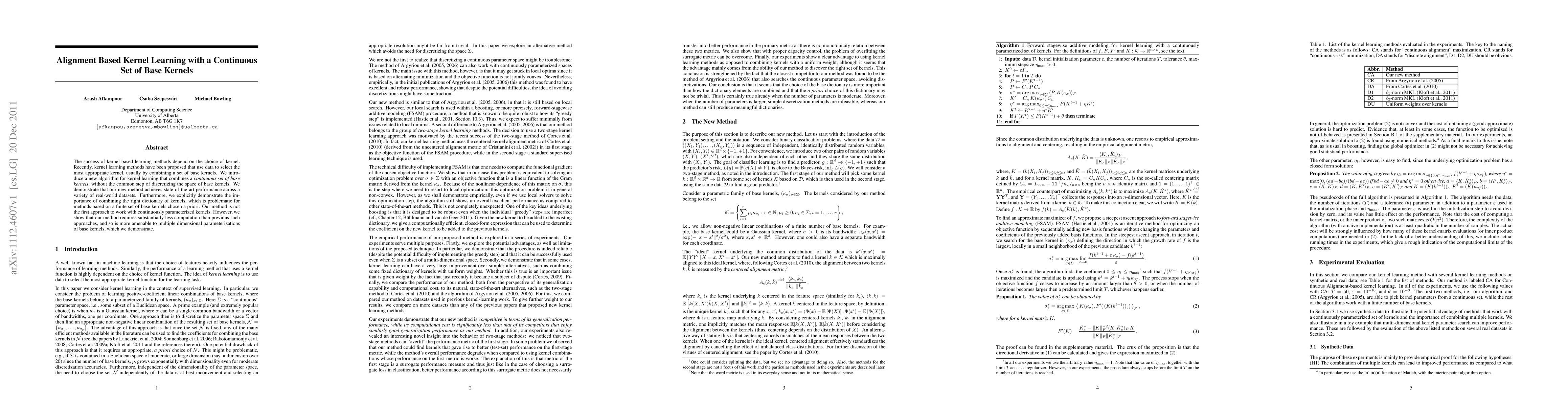 A new algorithm for kernel learning uses a continuous set of base kernels to select the most appropriate one, achieving state-of-the-art performance across various datasets without the need for discretizing the space of base kernels.