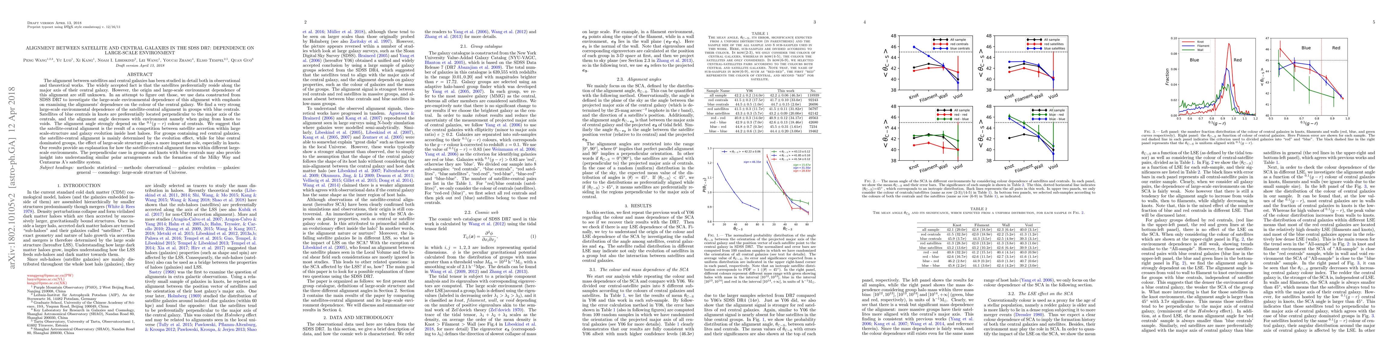 This study investigates the alignment between satellite and central galaxies in the SDSS DR7, finding a strong dependence on the large-scale environment, particularly for groups with blue central galaxies. The alignment angle is influenced by the ${}^{0.1}(g-r)$ colour of centrals, suggesting that large-scale structure effects are more significant in knots compared to voids.