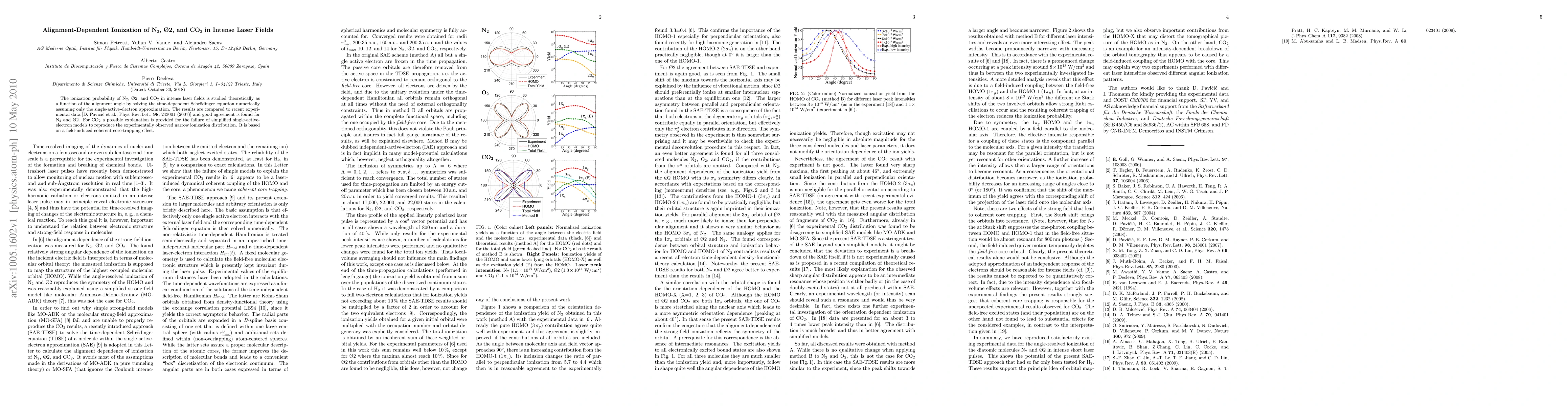 The ionization probability of N$_2$, O$_2$, and CO$_2$ in intense laser fields is studied theoretically as a function of the alignment angle by solving the time-dependent Schr\"odinger equation numerically assuming only the single-active-electron approximation. The results are compared to recent experimental data [D.~Pavi{\v{c}}i{\'c} et al., Phys.\,Rev.\,Lett.\ {\bf 98}, 243001 (2007)] and good agreement is found for N$_2$ and O$_2$. For CO$_2$ a possible explanation is provided for the failure of simplified single-active-electron models to reproduce the experimentally observed narrow ionization distribution. It is based on a field-induced coherent core-trapping effect.