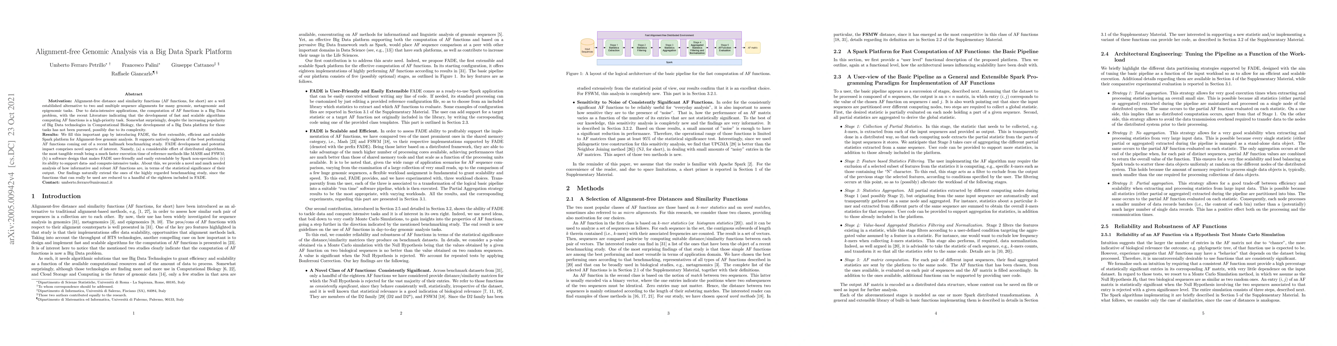 This paper introduces FADE, the first scalable Spark platform for alignment-free genomic analysis, supporting eighteen high-performing functions. It significantly improves execution time for reference methods and offers a user-friendly design for non-specialists, while also providing insights into the statistical significance of the functions' outputs.