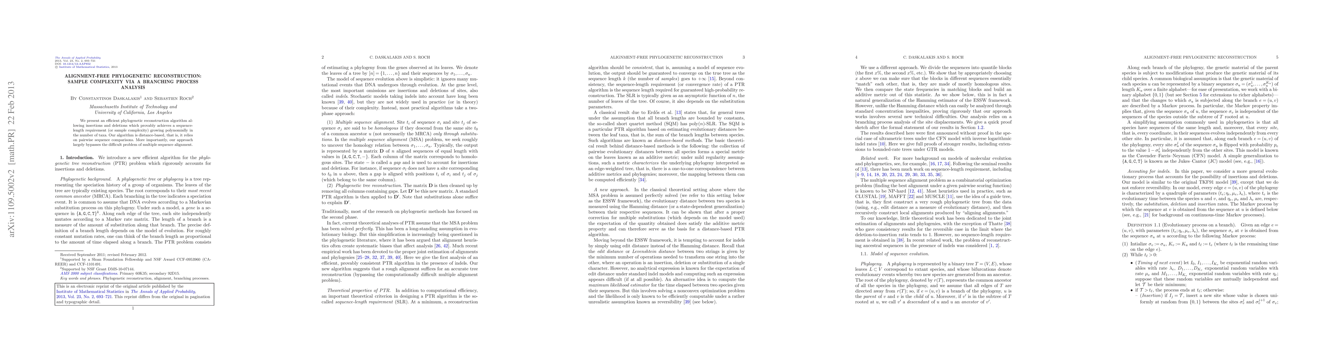 Summary: This paper introduces an efficient algorithm for phylogenetic reconstruction that accommodates insertions and deletions, achieving a polynomial sample complexity based on the number of taxa. The method relies on pairwise sequence comparisons, thus avoiding the complexities of multiple sequence alignment.