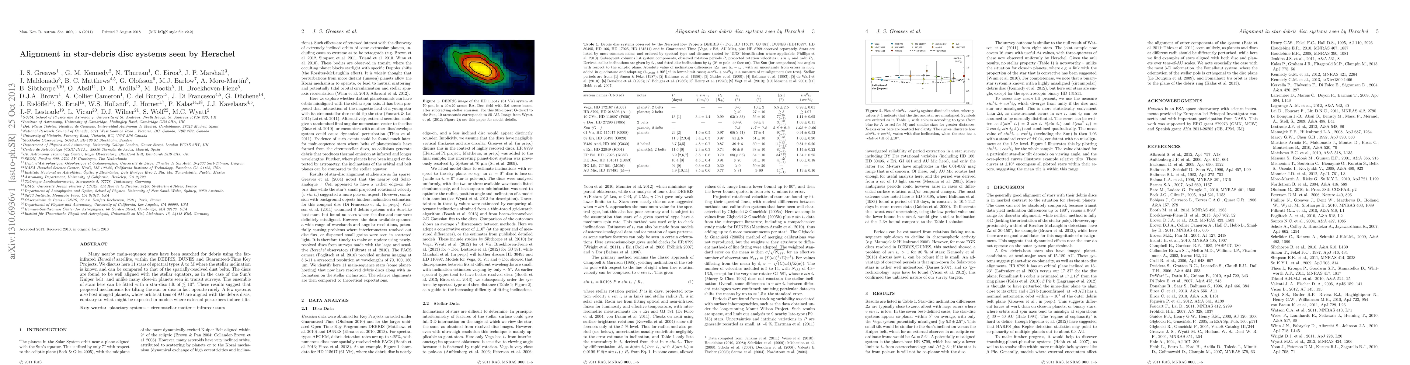 Many nearby main-sequence stars have been searched for debris using the far-infrared Herschel satellite, within the DEBRIS, DUNES and Guaranteed-Time Key Projects. We discuss here 11 stars of spectral types A to M where the stellar inclination is known and can be compared to that of the spatially-resolved dust belts. The discs are found to be well aligned with the stellar equators, as in the case of the Sun's Kuiper belt, and unlike many close-in planets seen in transit surveys. The ensemble of stars here can be fitted with a star-disc tilt of ~<10 degrees. These results suggest that proposed mechanisms for tilting the star or disc in fact operate rarely. A few systems also host imaged planets, whose orbits at tens of AU are aligned with the debris discs, contrary to what might be expected in models where external perturbers induce tilts.