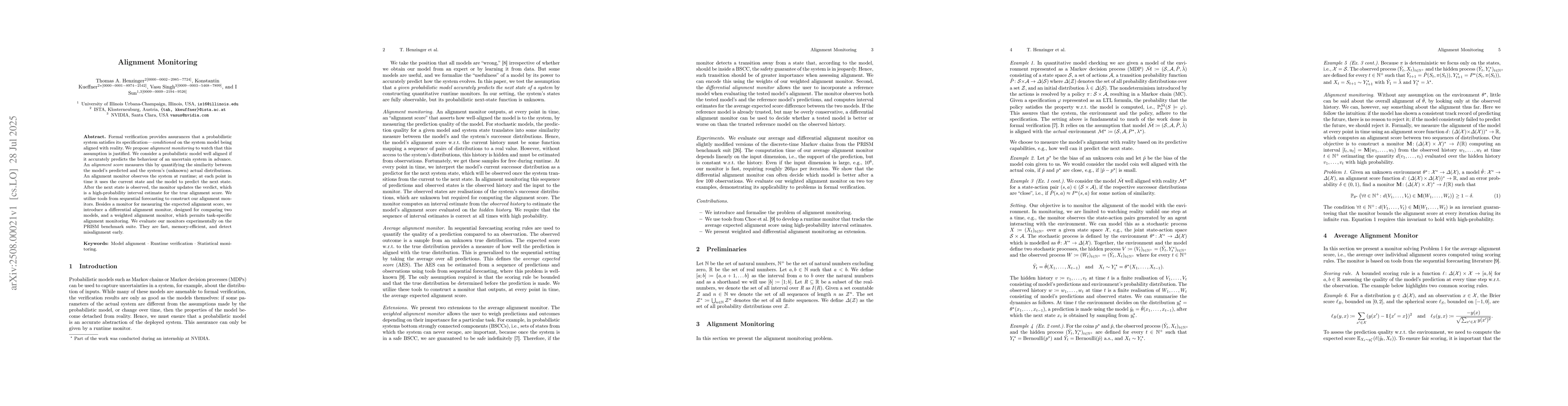 Formal verification provides assurances that a probabilistic system satisfies its specification--conditioned on the system model being aligned with reality. We propose alignment monitoring to watch that this assumption is justified. We consider a probabilistic model well aligned if it accurately predicts the behaviour of an uncertain system in advance. An alignment score measures this by quantifying the similarity between the model's predicted and the system's (unknown) actual distributions. An alignment monitor observes the system at runtime; at each point in time it uses the current state and the model to predict the next state. After the next state is observed, the monitor updates the verdict, which is a high-probability interval estimate for the true alignment score. We utilize tools from sequential forecasting to construct our alignment monitors. Besides a monitor for measuring the expected alignment score, we introduce a differential alignment monitor, designed for comparing two models, and a weighted alignment monitor, which permits task-specific alignment monitoring. We evaluate our monitors experimentally on the PRISM benchmark suite. They are fast, memory-efficient, and detect misalignment early.