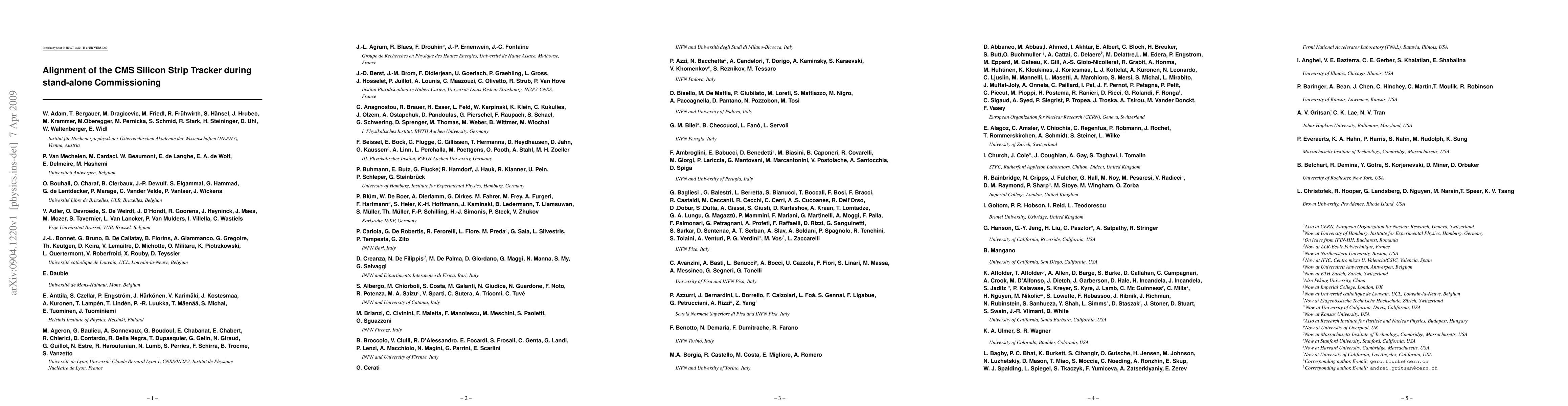 The CMS Silicon Strip Tracker alignment was achieved using cosmic tracks, optical surveys, and laser alignment systems in 2007. This initial alignment demonstrated precision comparable to random misalignment of 50-80 microns, validating system performance across varying temperatures.
