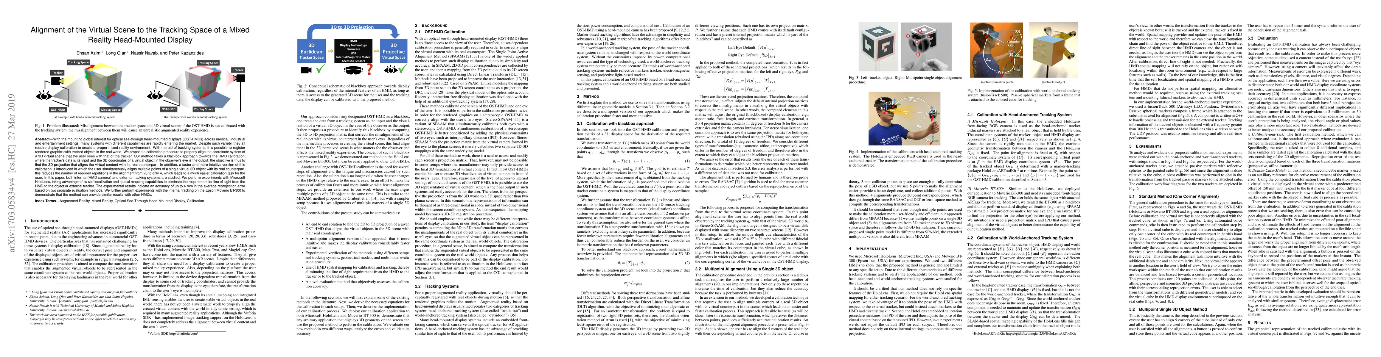 This paper proposes a calibration procedure to align the virtual scene of optical see-through head-mounted displays (OST-HMDs) with the tracking space, achieving an average reprojection error of up to 4 mm. It introduces a simplified calibration method requiring only four alignments instead of 20, tested on Microsoft HoloLens and Epson Moverio BT-300.