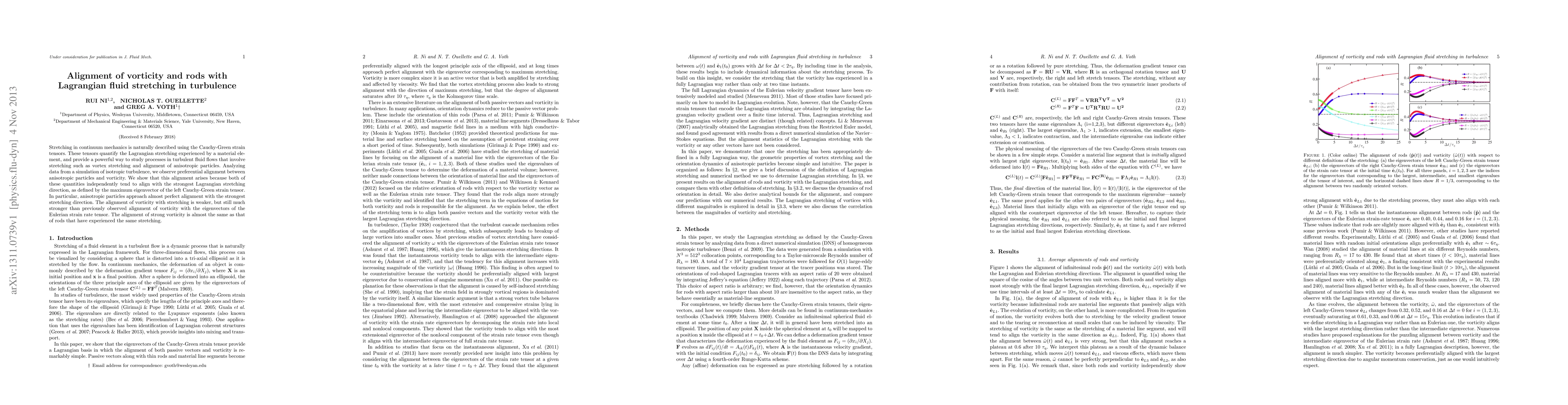 This paper investigates the alignment of anisotropic particles and vorticity with Lagrangian stretching in turbulent fluid flows. It finds that both tend to align with the direction of maximum stretching, defined by the maximum eigenvector of the left Cauchy-Green strain tensor, with particles showing near-perfect alignment.