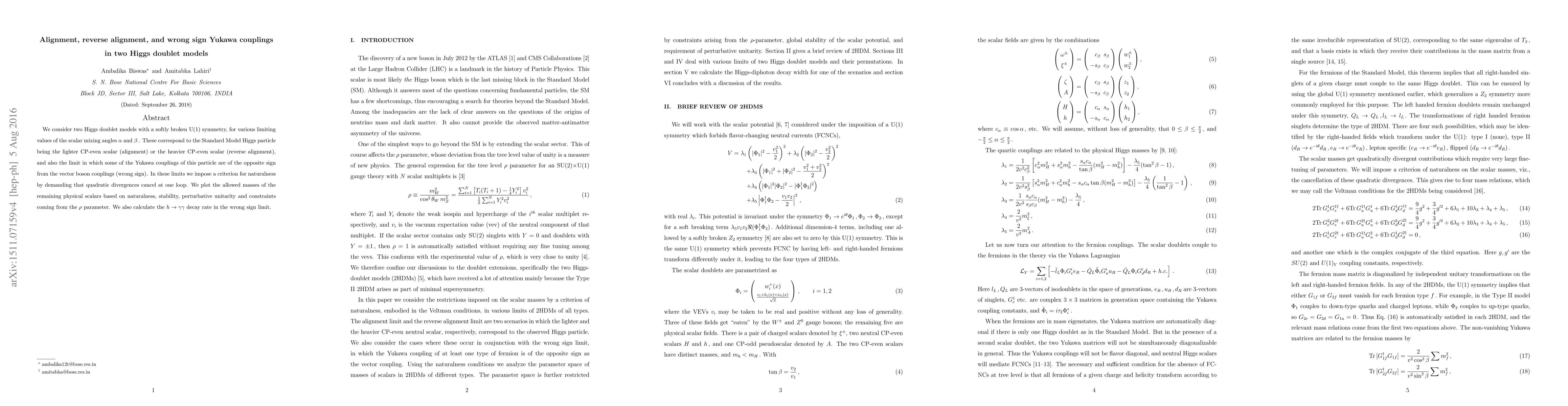 This paper examines two Higgs doublet models with softly broken U(1) symmetry, analyzing alignment, reverse alignment, and wrong sign Yukawa couplings. It imposes naturalness criteria and plots allowed scalar masses, considering stability, unitarity, and $\rho$ parameter constraints, and calculates the $h\to \gamma\gamma$ decay rate in the wrong sign limit.