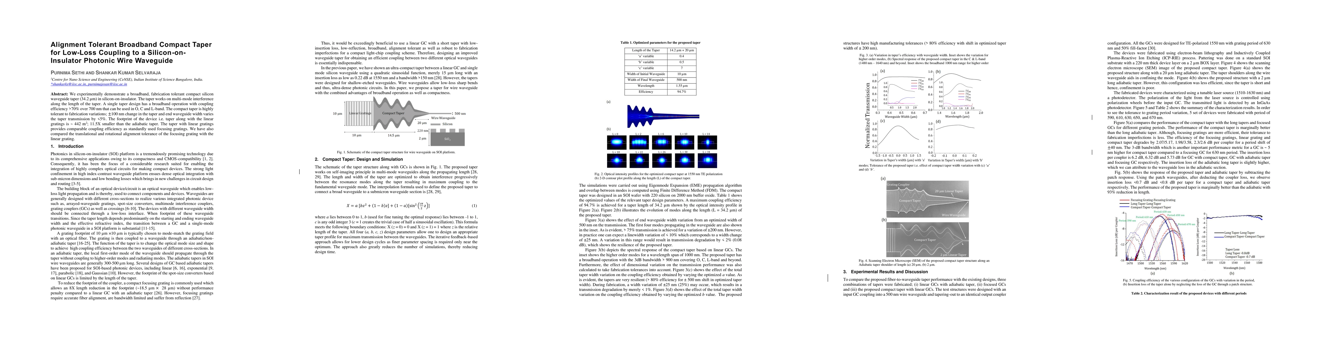 We experimentally demonstrate a broadband, fabrication tolerant, CMOS compatible compact silicon waveguide taper (34.2 um) in silicon-on-insulator wire waveguides. The taper works on multi-mode interference along the length of the taper. A single taper design has a broadband operation with coupling efficiency >70% over 700 nm that can be used in O, C and L-band. The compact taper is highly tolerant to fabrication variations; >100 nm change in the taper and end waveguide width varies the taper transmission by <5%. The footprint of the device i.e. taper along with the linear gratings is ~ 442 m2; i.e. 11.5X smaller than the adiabatic taper. The taper with linear gratings provides comparable coupling efficiency as standardly used focusing gratings. We have also compared the translational and rotational alignment tolerance of the focusing grating with the linear grating.