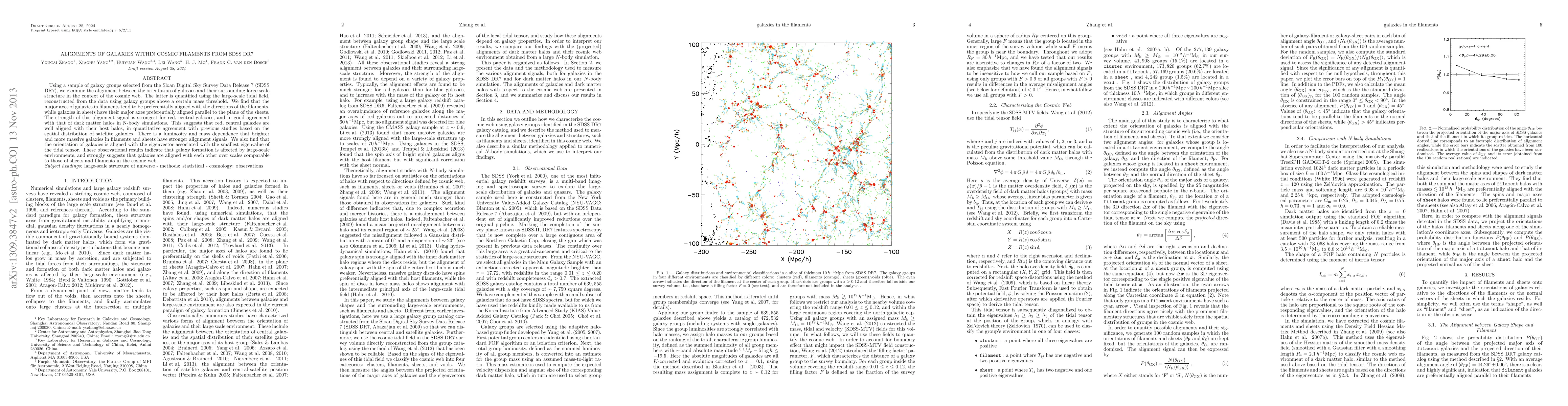 This study uses SDSS DR7 data to investigate galaxy alignments within cosmic filaments and sheets, finding that galaxies align with their large-scale structures, with stronger alignments in red, central galaxies and more massive, brighter galaxies. The alignment is consistent with dark matter halo orientations and suggests that galaxy formation is influenced by their cosmic environment.