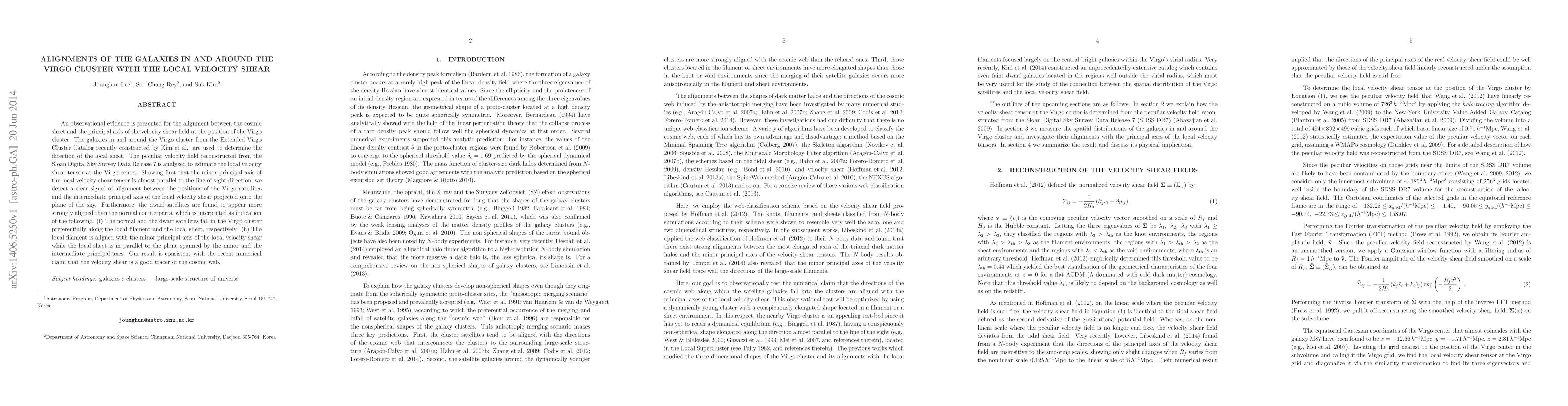 An observational evidence is presented for the alignment between the cosmic sheet and the principal axis of the velocity shear field at the position of the Virgo cluster. The galaxies in and around the Virgo cluster from the Extended Virgo Cluster Catalog recently constructed by Kim et al. are used to determine the direction of the local sheet. The peculiar velocity field reconstructed from the Sloan Digital Sky Survey Data Release 7 is analyzed to estimate the local velocity shear tensor at the Virgo center. Showing first that the minor principal axis of the local velocity shear tensor is almost parallel to the line of sight direction, we detect a clear signal of alignment between the positions of the Virgo satellites and the intermediate principal axis of the local velocity shear projected onto the plane of the sky. Furthermore, the dwarf satellites are found to appear more strongly aligned than the normal counterparts, which is interpreted as indication of the following: (i) The normal and the dwarf satellites fall in the Virgo cluster preferentially along the local filament and the local sheet, respectively. (ii) The local filament is aligned with the minor principal axis of the local velocity shear while the local sheet is in parallel to the plane spanned by the minor and the intermediate principal axes. Our result is consistent with the recent numerical claim that the velocity shear is a good tracer of the cosmic web.