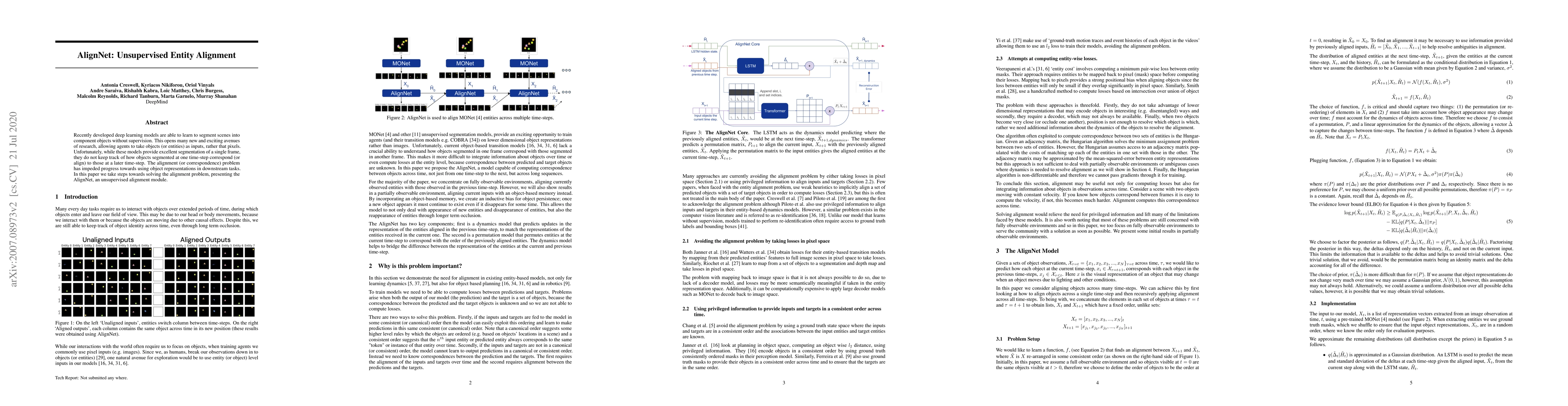 Recently developed deep learning models are able to learn to segment scenes into component objects without supervision. This opens many new and exciting avenues of research, allowing agents to take objects (or entities) as inputs, rather that pixels. Unfortunately, while these models provide excellent segmentation of a single frame, they do not keep track of how objects segmented at one time-step correspond (or align) to those at a later time-step. The alignment (or correspondence) problem has impeded progress towards using object representations in downstream tasks. In this paper we take steps towards solving the alignment problem, presenting the AlignNet, an unsupervised alignment module.