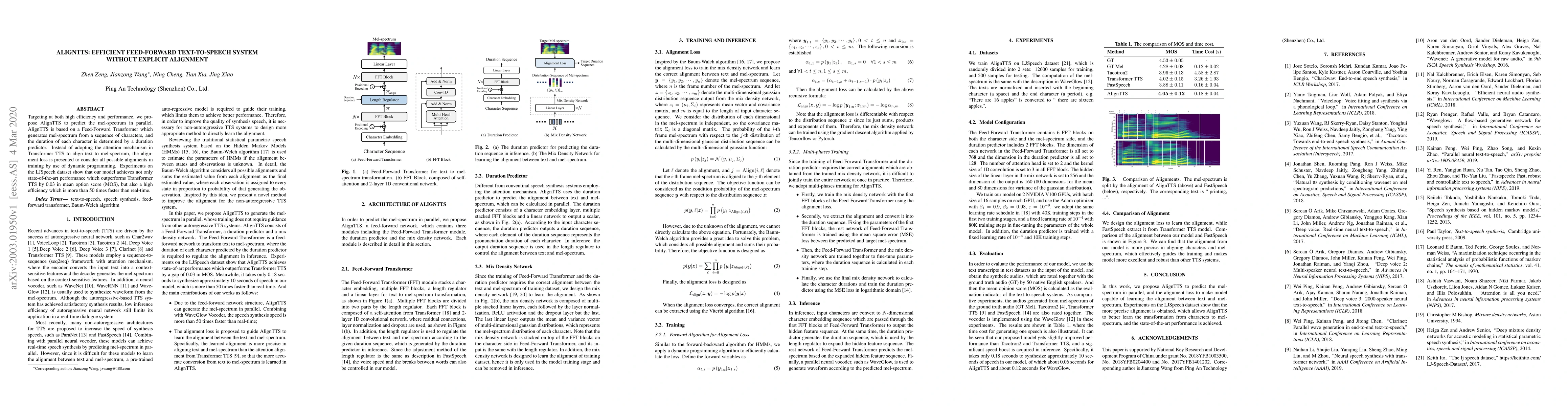 Targeting at both high efficiency and performance, we propose AlignTTS to predict the mel-spectrum in parallel. AlignTTS is based on a Feed-Forward Transformer which generates mel-spectrum from a sequence of characters, and the duration of each character is determined by a duration predictor.Instead of adopting the attention mechanism in Transformer TTS to align text to mel-spectrum, the alignment loss is presented to consider all possible alignments in training by use of dynamic programming. Experiments on the LJSpeech dataset show that our model achieves not only state-of-the-art performance which outperforms Transformer TTS by 0.03 in mean option score (MOS), but also a high efficiency which is more than 50 times faster than real-time.