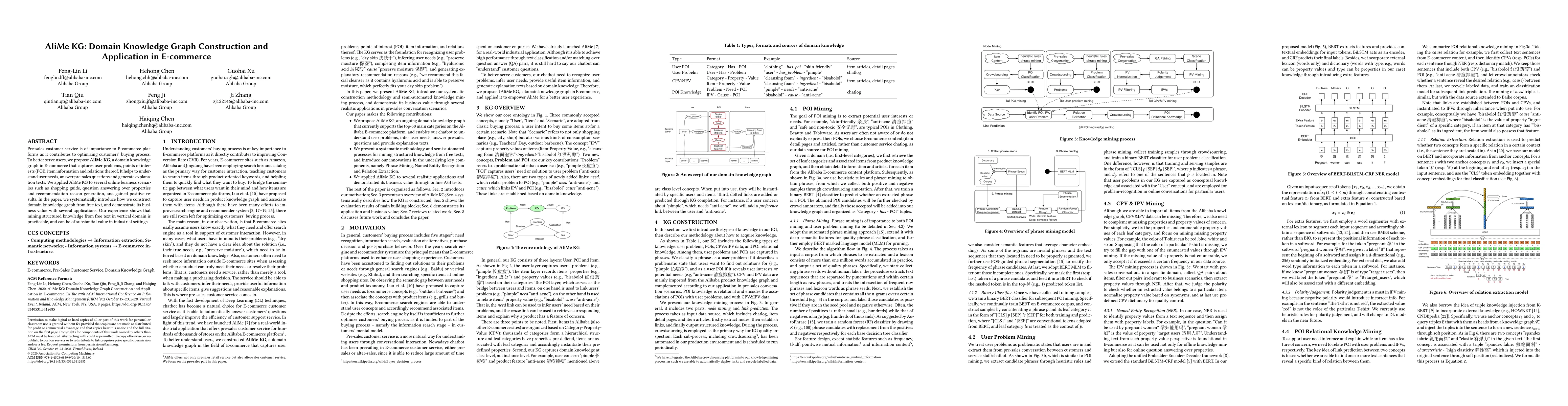 Title: AliMe KG: Domain Knowledge Graph Construction and Application in E-commerce Summary: This paper introduces AliMe KG, a domain knowledge graph for E-commerce that captures user problems and item information to optimize customer service. It demonstrates successful applications in shopping guides, question answering, and recommendation reason generation, showcasing the value of structured knowledge derived from free text in industrial settings.