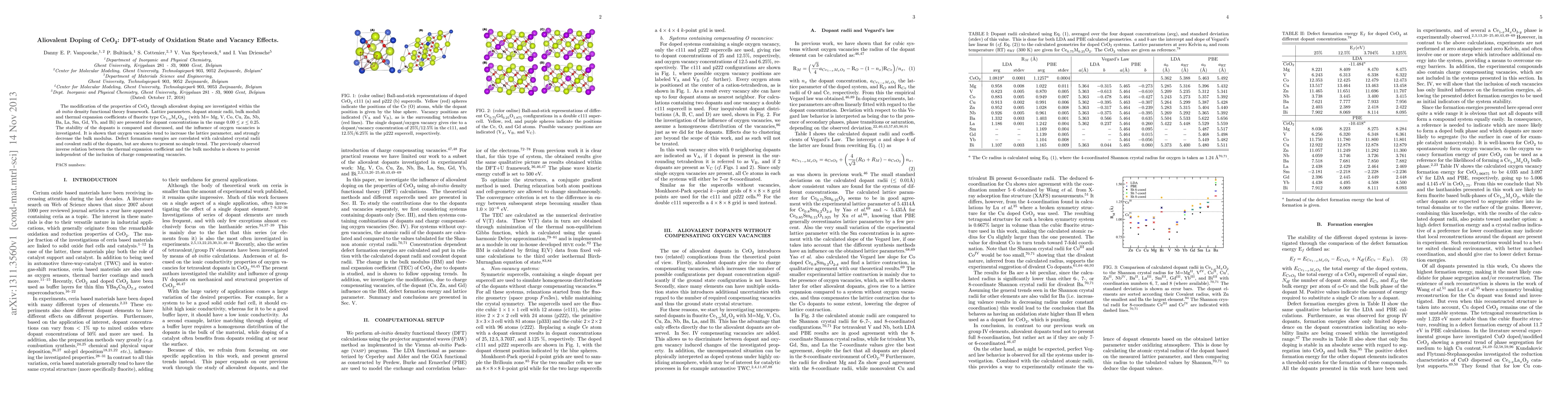 This paper investigates the effects of aliovalent doping on CeO$_2$ using DFT, focusing on lattice parameters, bulk moduli, and thermal expansion coefficients for various dopants. Oxygen vacancies are found to increase lattice parameters and decrease bulk moduli, while defect formation energies do not follow a simple trend with dopant radii.