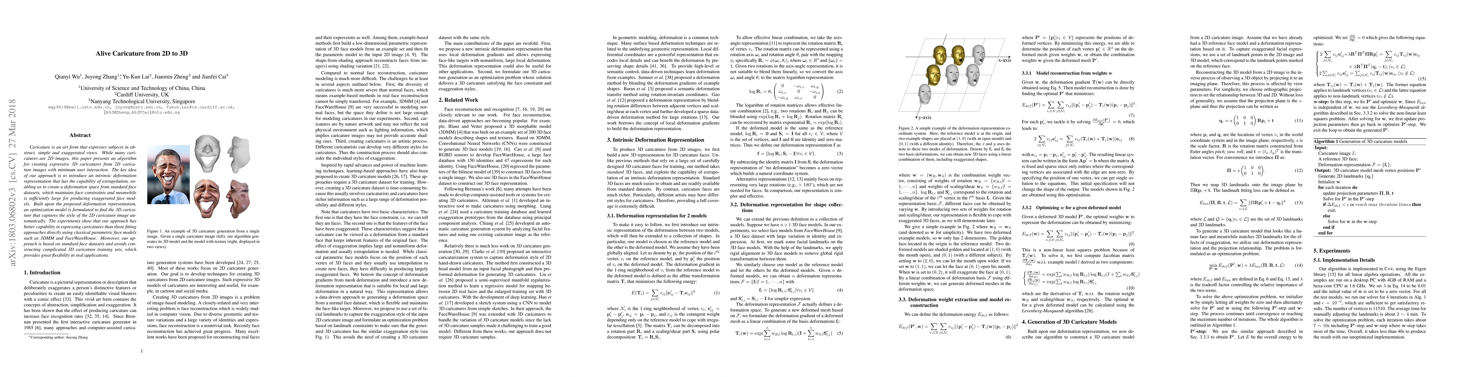 This paper presents an algorithm for generating 3D caricatures from 2D images with minimal user input, utilizing an intrinsic deformation representation to create a deformation space from standard face datasets. The method outperforms traditional parametric face models in expressing caricatures while offering flexibility in real-world applications.