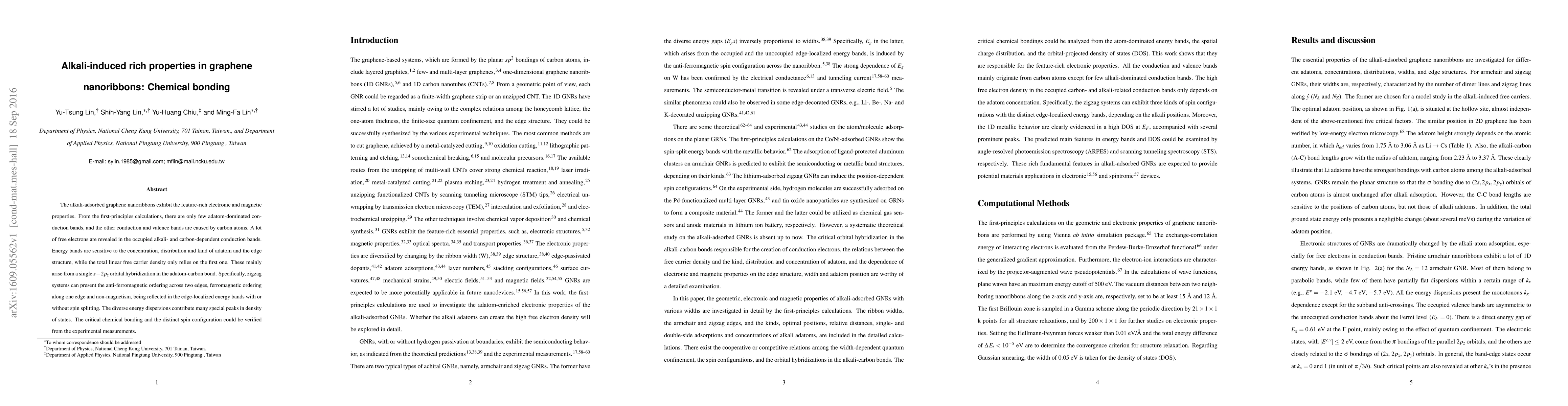 The alkali-adsorbed graphene nanoribbons exhibit the feature-rich electronic and magnetic properties. From the first-principles calculations, there are only few adatom-dominated conduction bands, and the other conduction and valence bands are caused by carbon atoms. A lot of free electrons are revealed in the occupied alkali- and carbon-dependent conduction bands. Energy bands are sensitive to the concentration, distribution and kind of adatom and the edge structure, while the total linear free carrier density only relies on the first one. These mainly arise from a single $s-2p_z$ orbital hybridization in the adatom-carbon bond. Specifically, zigzag systems can present the anti-ferromagnetic ordering across two edges, ferromagnetic ordering along one edge and non-magnetism, being reflected in the edge-localized energy bands with or without spin splitting. The diverse energy dispersions contribute many special peaks in density of states. The critical chemical bonding and the distinct spin configuration could be verified from the experimental measurements.
