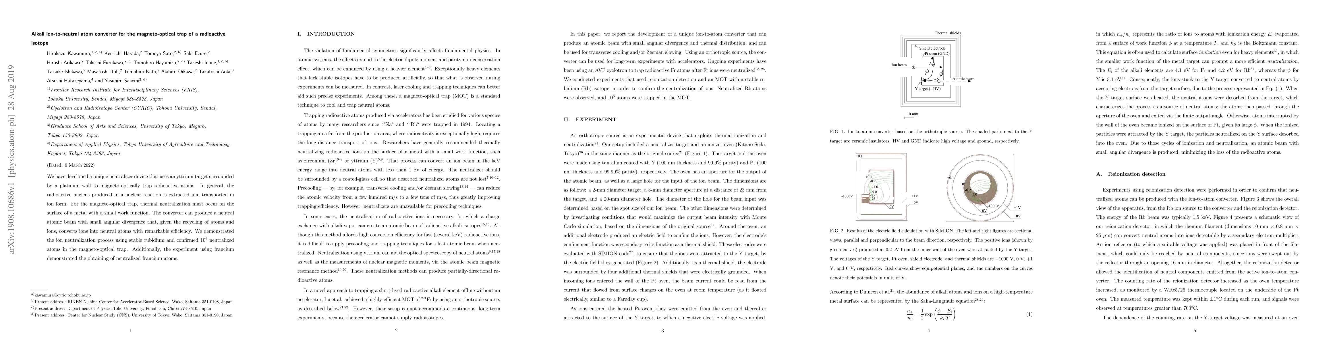 This research developed a neutralizer device utilizing a yttrium target and platinum wall to convert ions into neutral atoms for a magneto-optical trap, demonstrating efficient neutralization of rubidium and successful capture of francium atoms.