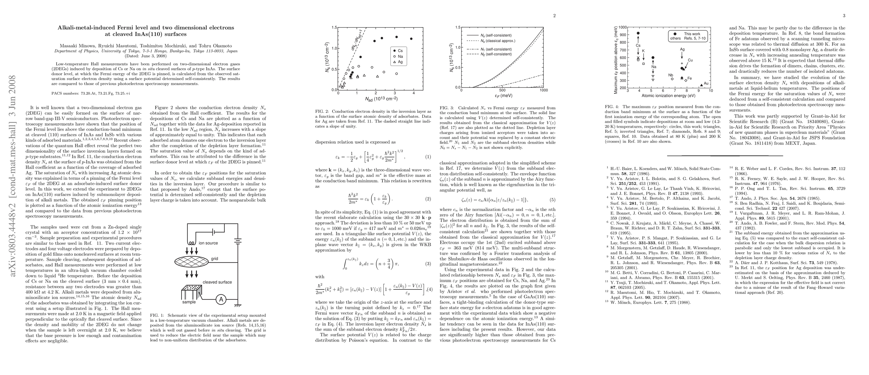 This study investigates the Fermi level pinning in two-dimensional electron gases (2DEGs) on cleaved InAs(110) surfaces induced by alkali metals Cs and Na, using low-temperature Hall measurements. The surface donor level is calculated from the saturation electron density and self-consistently determined surface potential, and results are compared with previous photoelectron spectroscopy findings.