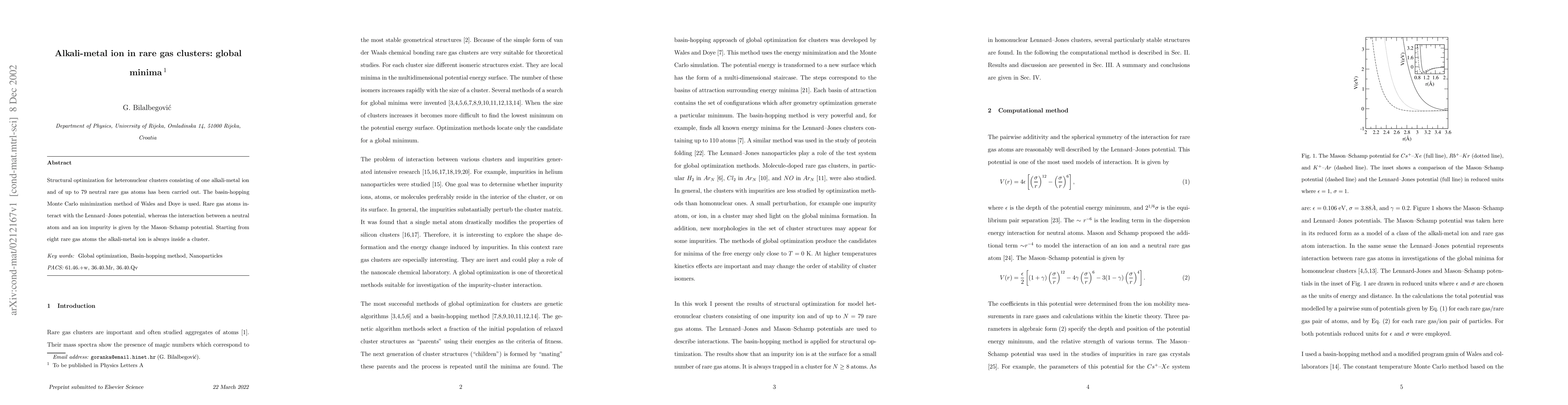 The application of the basin-hopping Monte Carlo method to find global minima configurations of alkali-metal ion-rare gas clusters.