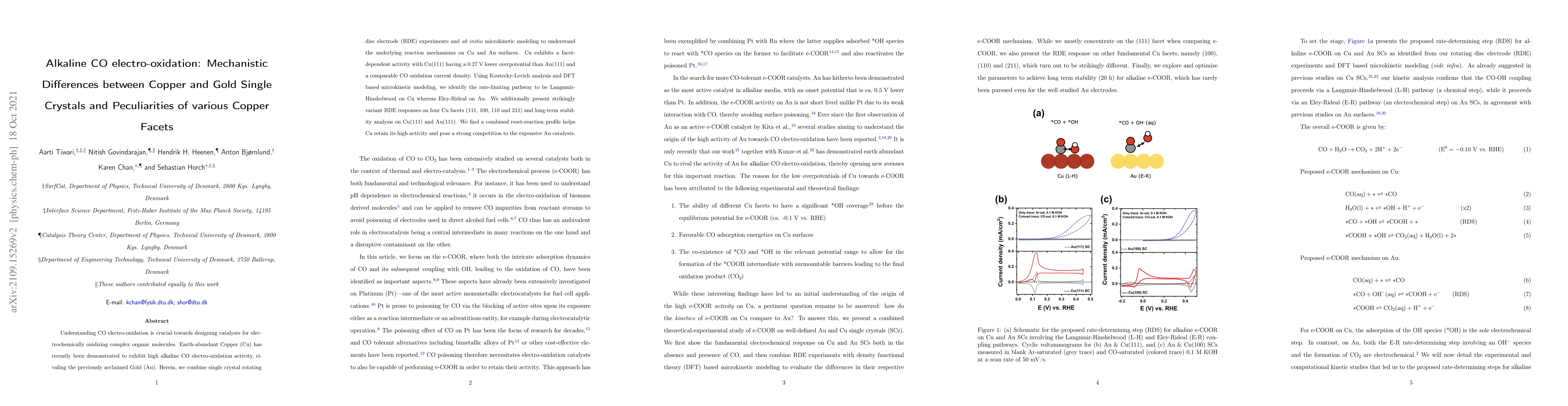 This paper investigates the mechanistic differences in alkaline CO electro-oxidation between copper and gold single crystals, revealing that copper exhibits facet-dependent activity with Cu(111) outperforming Au(111) in overpotential and current density. The study combines experimental and theoretical approaches to identify the rate-limiting pathways and stability profiles, showing copper's potential to rival gold catalysts.