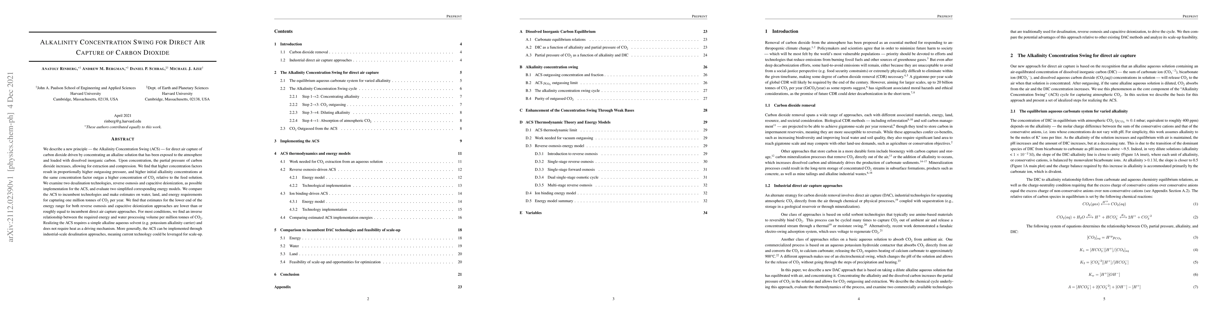 The Alkalinity Concentration Swing (ACS) method captures CO2 by concentrating an alkaline solution exposed to air, increasing CO2 outgassing pressure for extraction. Compared to existing technologies, ACS shows lower or comparable energy requirements, leveraging desalination technologies like reverse osmosis and capacitive deionization, and requires no heat for operation.