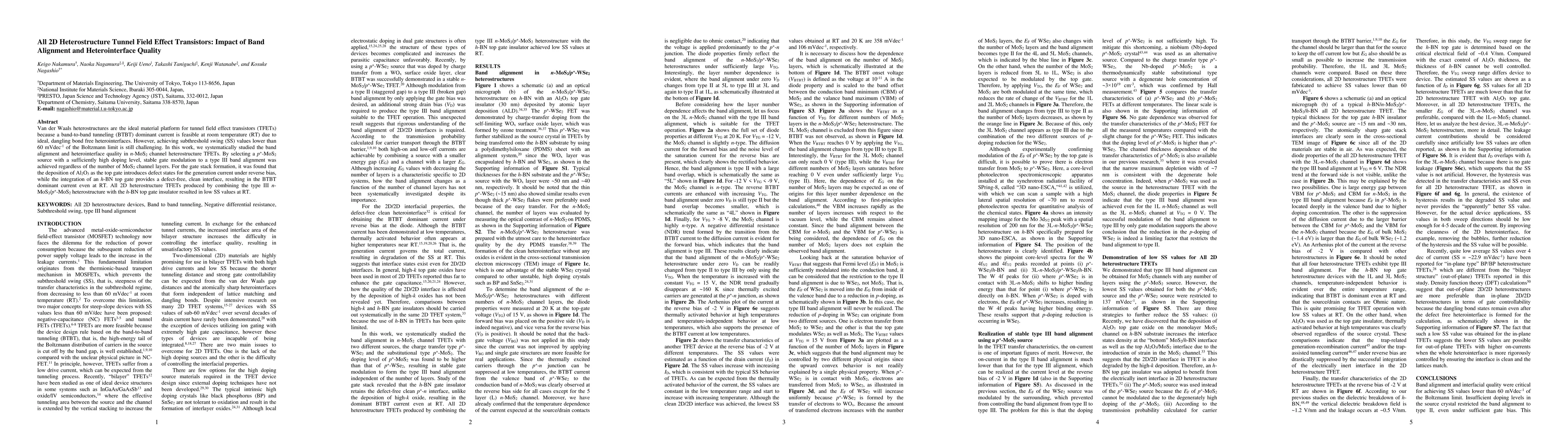 This paper investigates the impact of band alignment and heterointerface quality on 2D heterostructure tunnel field effect transistors (TFETs) using n-MoS2 channels. The study finds that a type III band alignment with high doping p+-MoS2 sources and an h-BN top gate insulator results in defect-free interfaces and low subthreshold swing values at room temperature.