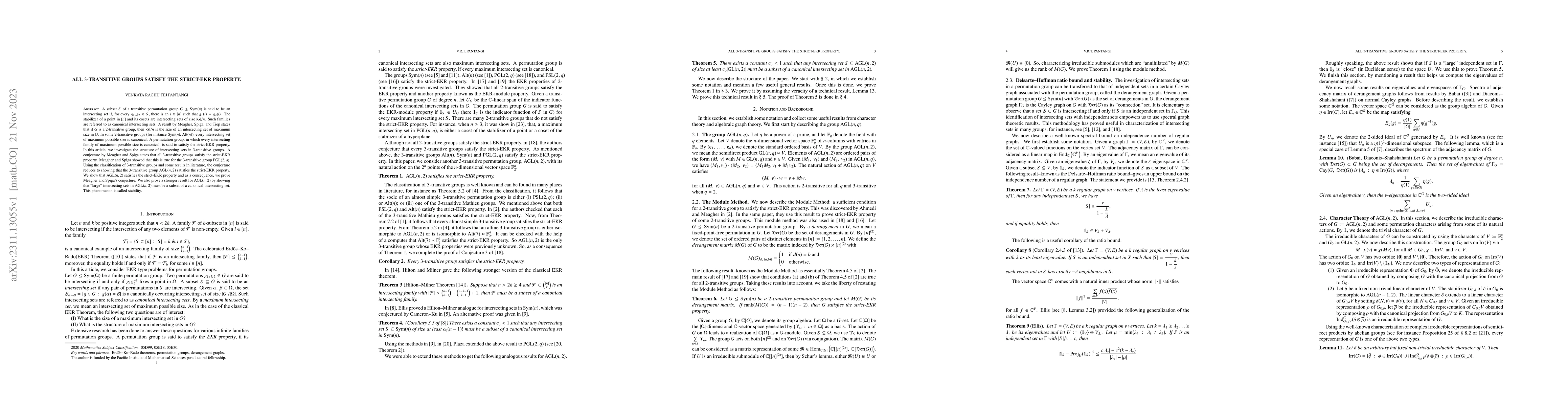 This paper proves that all $3$-transitive groups satisfy the strict-EKR property, confirming a conjecture by Meagher and Spiga. It specifically shows that the $3$-transitive group $\mathrm{AGL}(n,2)$ meets this criterion, thereby extending the result to all such groups.