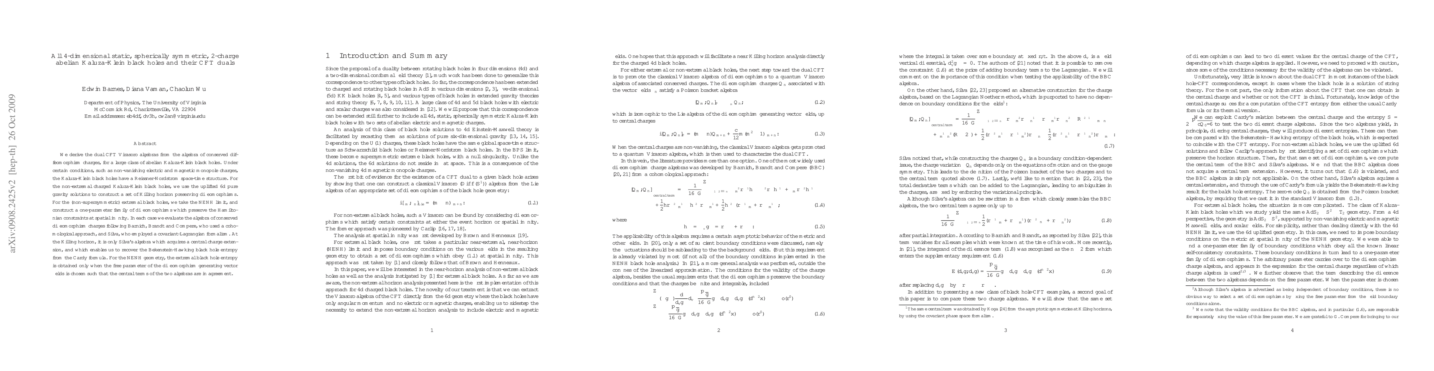 This paper derives the Virasoro algebras of dual conformal field theories (CFT) from conserved diffeomorphism charges for various 4-dimensional static, spherically symmetric, 2-charge abelian Kaluza-Klein black holes. It shows that under certain conditions, these black holes exhibit a Reissner-Nordstrom structure and uses different methods to construct diffeomorphisms for non-extremal and extremal cases, ultimately linking black hole entropy to the Cardy formula.