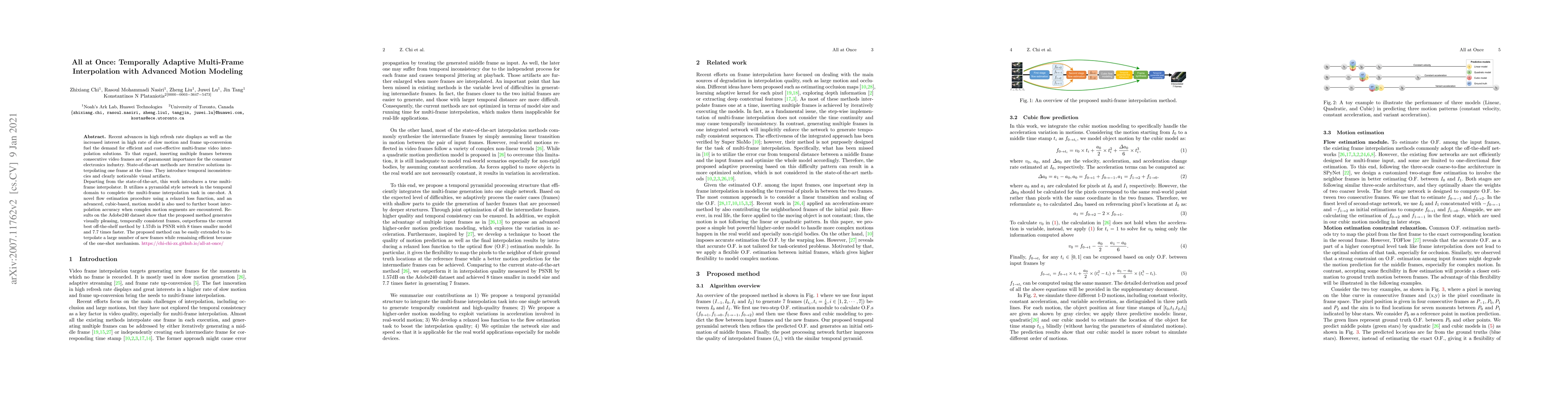 Recent advances in high refresh rate displays as well as the increased interest in high rate of slow motion and frame up-conversion fuel the demand for efficient and cost-effective multi-frame video interpolation solutions. To that regard, inserting multiple frames between consecutive video frames are of paramount importance for the consumer electronics industry. State-of-the-art methods are iterative solutions interpolating one frame at the time. They introduce temporal inconsistencies and clearly noticeable visual artifacts. Departing from the state-of-the-art, this work introduces a true multi-frame interpolator. It utilizes a pyramidal style network in the temporal domain to complete the multi-frame interpolation task in one-shot. A novel flow estimation procedure using a relaxed loss function, and an advanced, cubic-based, motion model is also used to further boost interpolation accuracy when complex motion segments are encountered. Results on the Adobe240 dataset show that the proposed method generates visually pleasing, temporally consistent frames, outperforms the current best off-the-shelf method by 1.57db in PSNR with 8 times smaller model and 7.7 times faster. The proposed method can be easily extended to interpolate a large number of new frames while remaining efficient because of the one-shot mechanism.