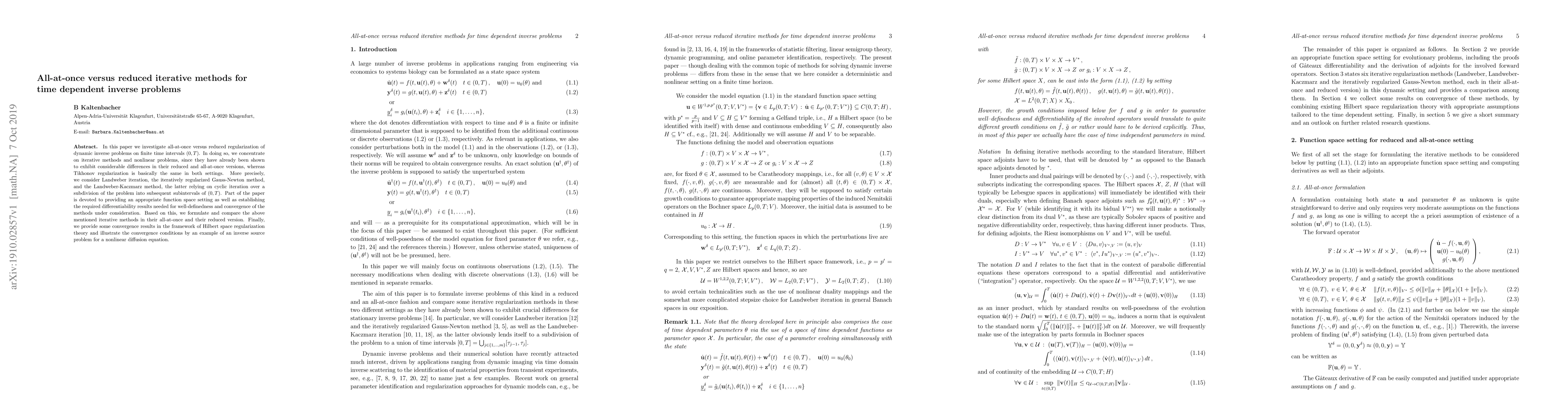 This paper compares all-at-once and reduced iterative methods for solving dynamic inverse problems on finite time intervals, focusing on Landweber iteration, the iteratively regularized Gauss-Newton method, and the Landweber-Kaczmarz method. It establishes the necessary function space and differentiability results for convergence and provides convergence results within the framework of Hilbert space regularization theory, illustrated by an inverse source problem example.