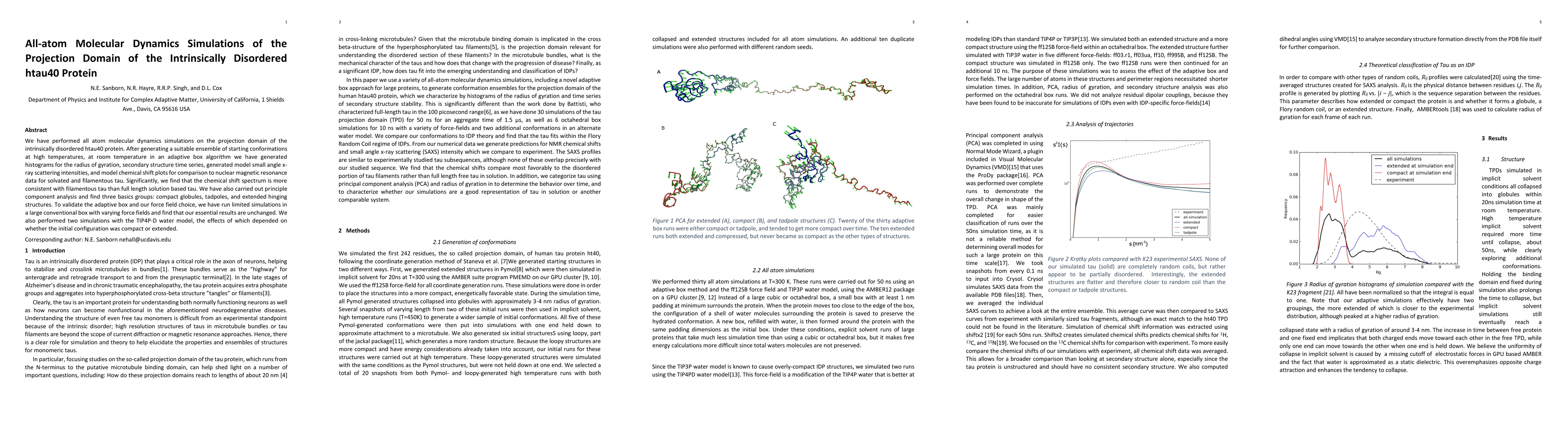 Researchers used molecular dynamics simulations to study the htau40 protein, finding that its chemical shift spectrum is more consistent with a filamentous tau structure than previously thought. The simulations also identified three distinct groups of conformations: compact globules, tadpoles, and extended hinge structures.