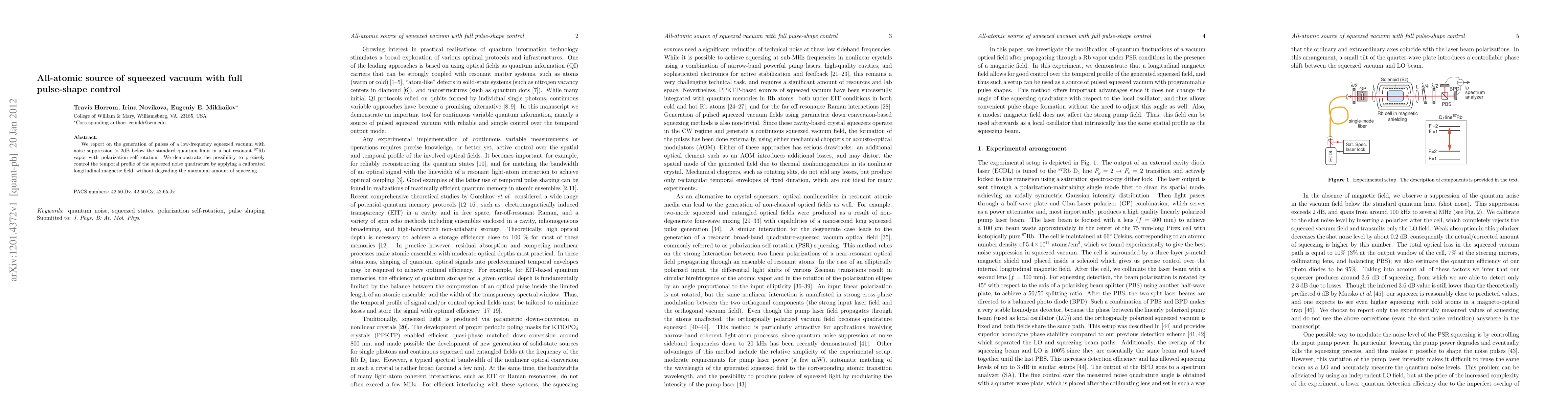 This paper details the creation of low-frequency squeezed vacuum pulses in a hot 87 Rb vapor, achieving noise suppression exceeding 2 dB below the quantum limit. The authors also show precise control over the pulse shape via a calibrated magnetic field, without compromising the level of squeezing.
