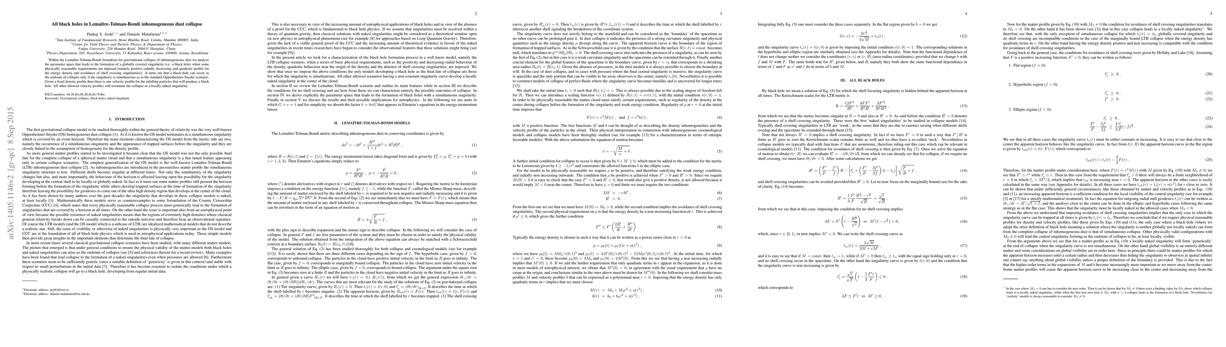 This paper explores the conditions under which black holes form in the Lemaitre-Tolman-Bondi model of inhomogeneous dust collapse, finding that only simultaneous singularities, akin to the Oppenheimer-Snyder scenario, result in globally covered singularities (black holes), while other velocity profiles lead to locally naked singularities.