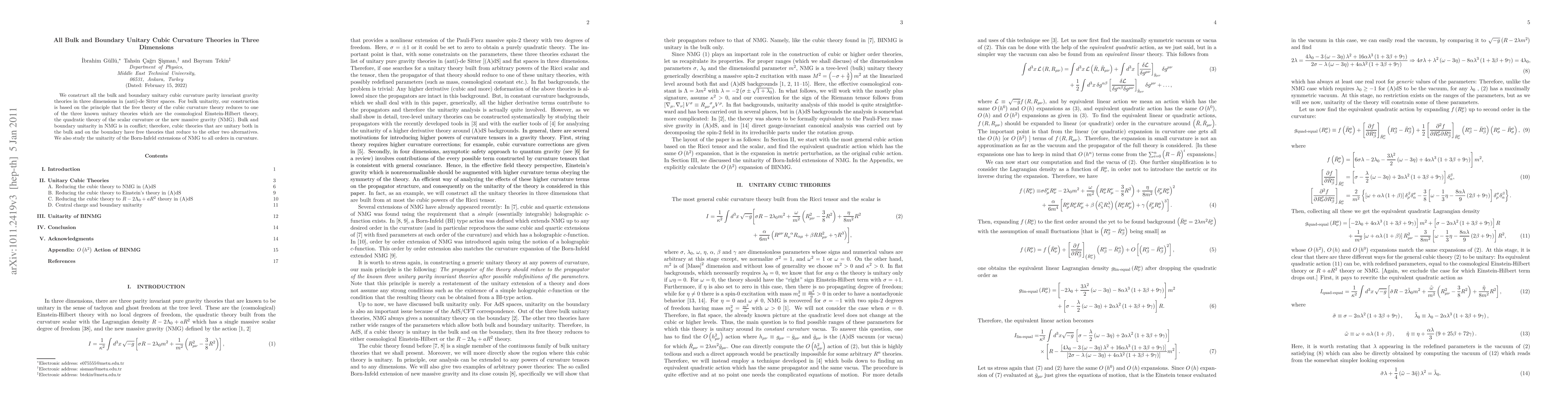 We construct all the bulk and boundary unitary cubic curvature parity invariant gravity theories in three dimensions in (anti)-de Sitter spaces. For bulk unitarity, our construction is based on the principle that the free theory of the cubic curvature theory reduces to one of the three known unitary theories which are the cosmological Einstein-Hilbert theory, the quadratic theory of the scalar curvature or the new massive gravity (NMG). Bulk and boundary unitarity in NMG is in conflict; therefore, cubic theories that are unitary both in the bulk and on the boundary have free theories that reduce to the other two alternatives. We also study the unitarity of the Born-Infeld extensions of NMG to all orders in curvature.