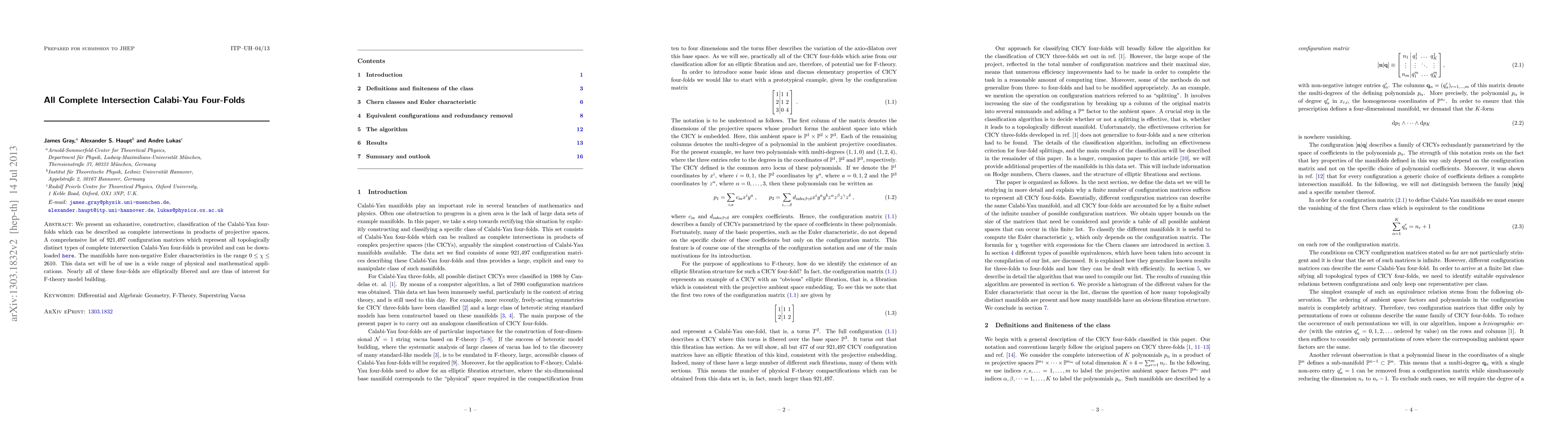 The research presents a comprehensive classification of Calabi-Yau four-folds as complete intersections in products of projective spaces, providing a list of 921,497 configuration matrices representing all topologically distinct types.