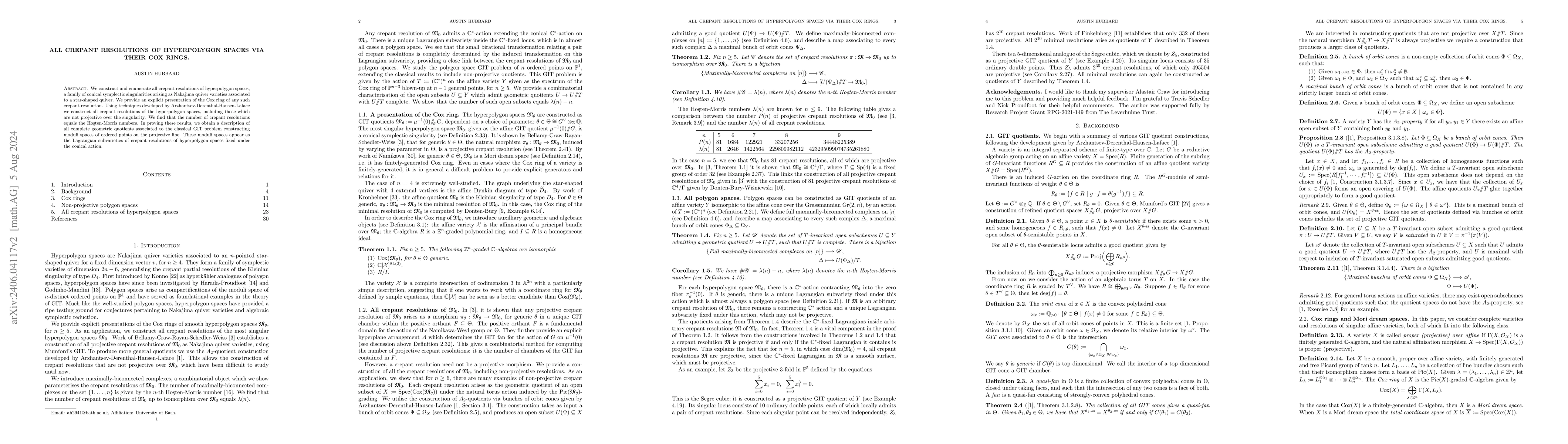 This paper constructs and enumerates all crepant resolutions of hyperpolygon spaces, revealing that their number matches Høst-Morris numbers. The study uses Cox rings to provide explicit presentations and finds moduli spaces of ordered points on the projective line as Lagrangian subvarieties within these resolutions.