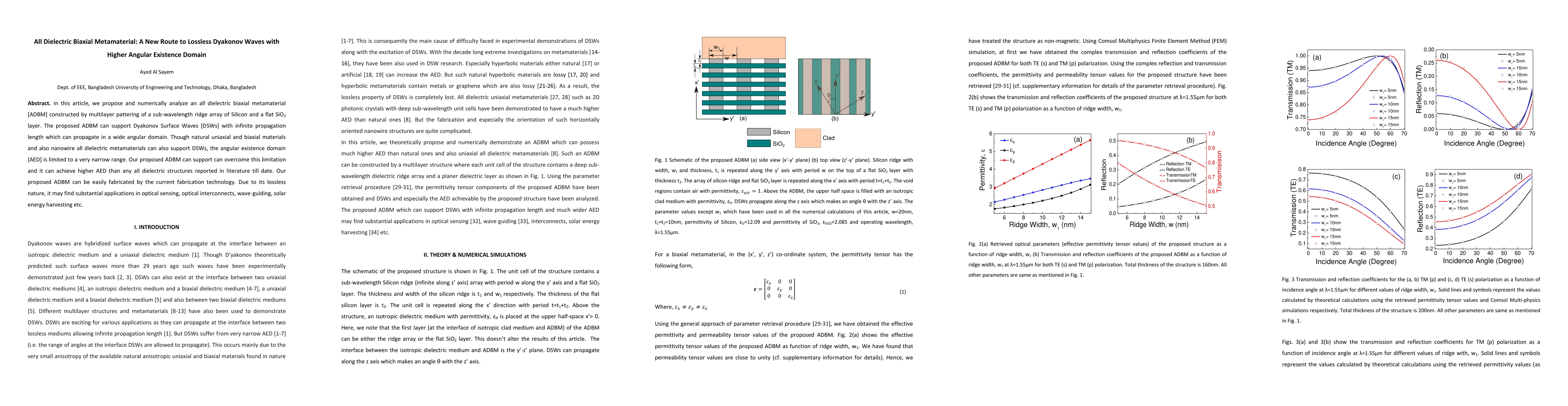 In this article, we propose and numerically analyze an all dielectric biaxial metamaterial [ADBM] constructed by multilayer pattering of a sub-wavelength ridge array of Silicon and a flat SiO2 layer. The proposed ADBM can support Dyakonov Surface Waves [DSWs] with infinite propagation length which can propagate in a wide angular domain. Though natural uniaxial and biaxial materials and also nanowire all dielectric metamaterials can also support DSWs, the angular existence domain [AED] is limited to a very narrow range. Our proposed ADBM can support can overcome this limitation and it can achieve higher AED than any all dielectric structures reported in literature till date. Our proposed ADBM can be easily fabricated by the current fabrication technology. Due to its lossless nature, it may find substantial applications in optical sensing, optical interconnects, wave-guiding, solar energy harvesting etc.