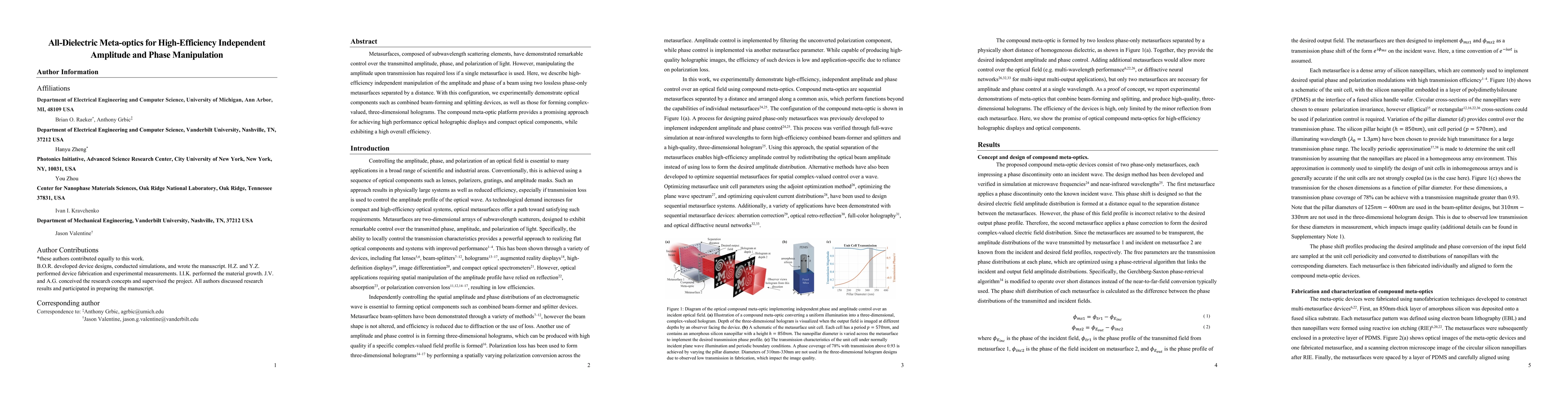 This paper proposes a method for high-efficiency independent manipulation of light amplitude and phase using two lossless phase-only metasurfaces. The configuration allows for advanced optical components like beam-forming and complex-holographic displays with minimal losses.