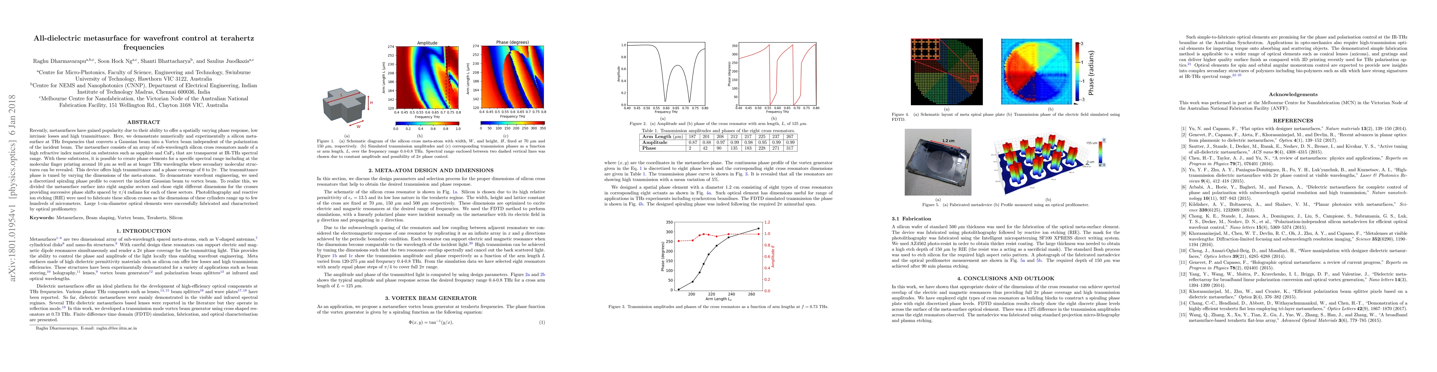 This paper presents a silicon metasurface composed of sub-wavelength silicon cross resonators that converts Gaussian beams into vortex beams at terahertz frequencies. The metasurface achieves high transmittance and phase coverage from 0 to $2\pi$ by tuning the dimensions of the silicon cross resonators, enabling wavefront control and potential applications in molecular fingerprinting and secondary molecular structure detection.