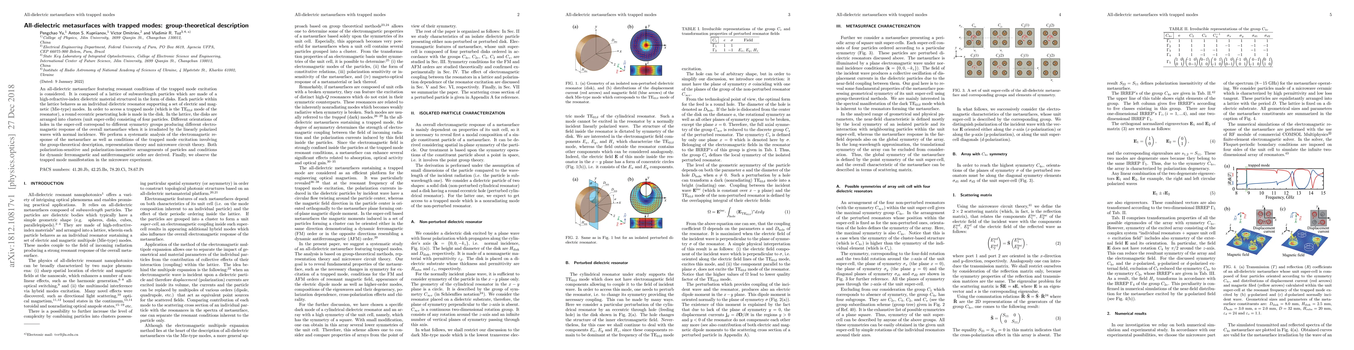 This paper explores an all-dielectric metasurface composed of high-refractive-index dielectric disks with trapped modes, utilizing group theory to analyze its electromagnetic response. Experimental results confirm the theoretical predictions of the metasurface's polarization-sensitive behavior.