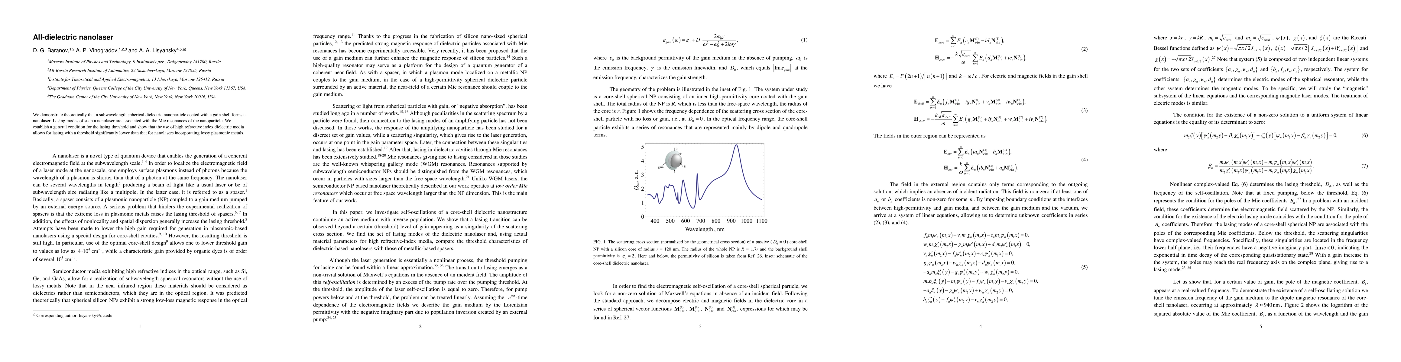 This paper theoretically proposes a subwavelength spherical dielectric nanoparticle coated with a gain shell as a nanolaser, utilizing Mie resonances for lasing modes. It establishes a lasing threshold condition and demonstrates that high refractive index dielectric materials can achieve significantly lower lasing thresholds compared to plasmonic metal-based nanolasers.