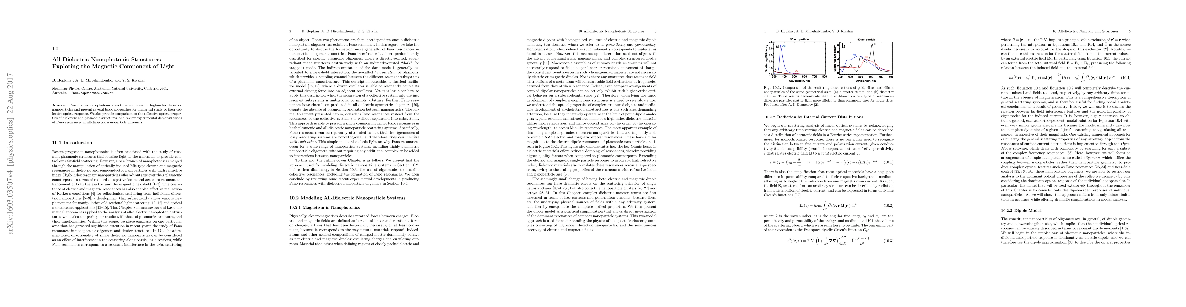 Summary: This paper explores the magnetic component of light in all-dielectric nanophotonic structures, presenting numerical studies on their collective optical response and comparing them with plasmonic structures, while also reviewing experimental demonstrations of Fano resonances in dielectric nanoparticle oligomers.