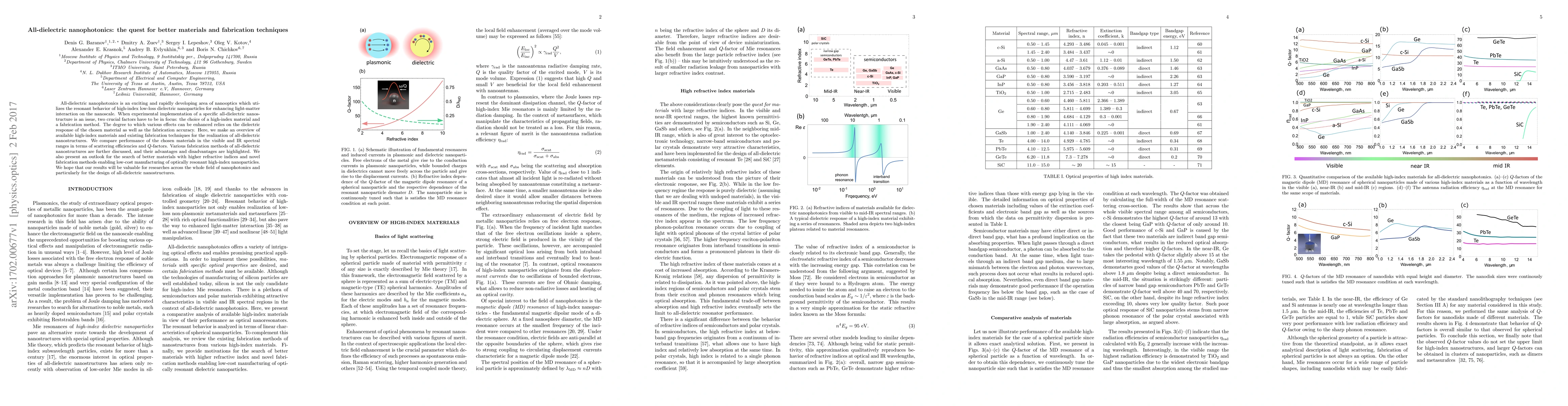 This paper reviews high-index materials and fabrication techniques for all-dielectric nanophotonics, comparing their performance in visible and IR spectral ranges and highlighting the pros and cons of various methods to enhance light-matter interaction. The outlook suggests seeking better materials and novel fabrication approaches for low-cost manufacturing.