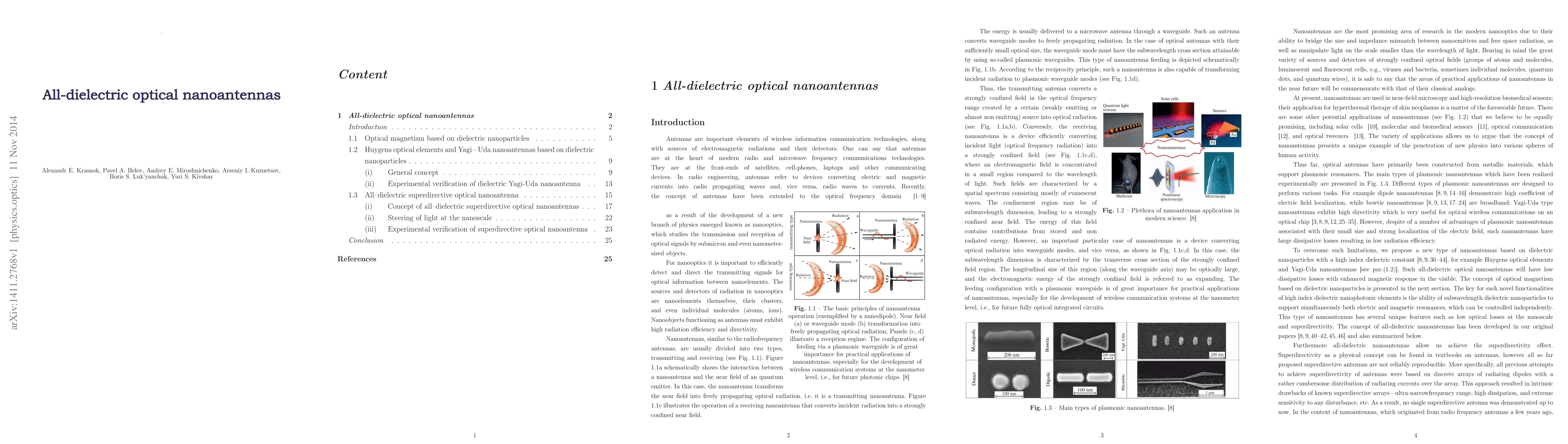 This paper reviews all-dielectric optical nanoantennas, proposing a new highly efficient Yagi-Uda nanoantenna and introducing superdirective nanoantennas based on silicon nanoparticles with strong magnetic resonances. Both types are analyzed analytically, numerically, and experimentally, with predictions of subwavelength beam steering sensitivity.