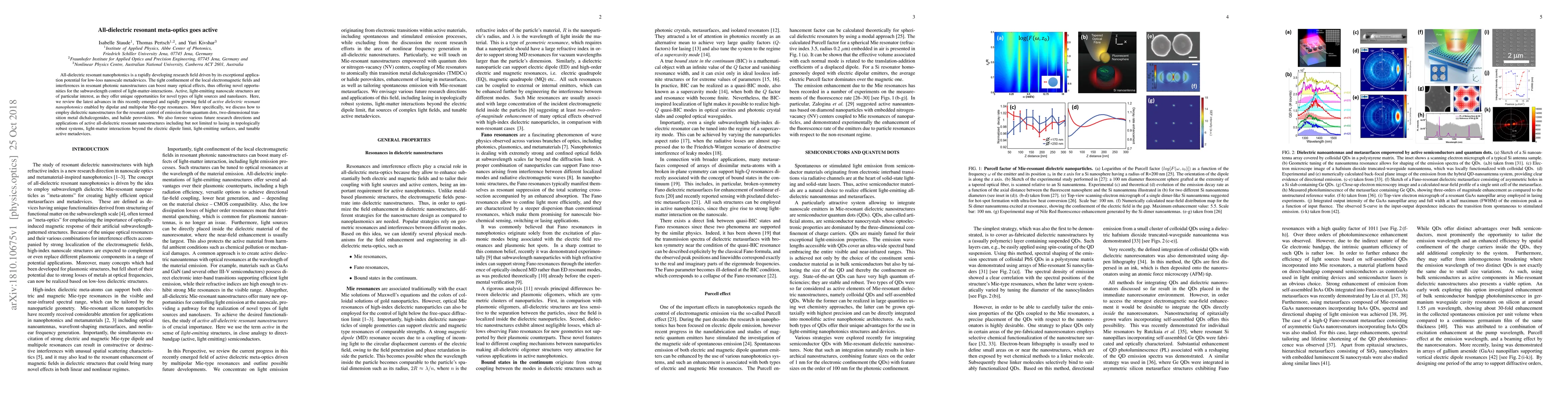This paper reviews recent advancements in active all-dielectric resonant nanophotonics, focusing on using dielectric nanostructures to control emission from quantum dots and other materials. It outlines future research possibilities, including novel light sources, topologically robust lasing, and tunable metadevices.