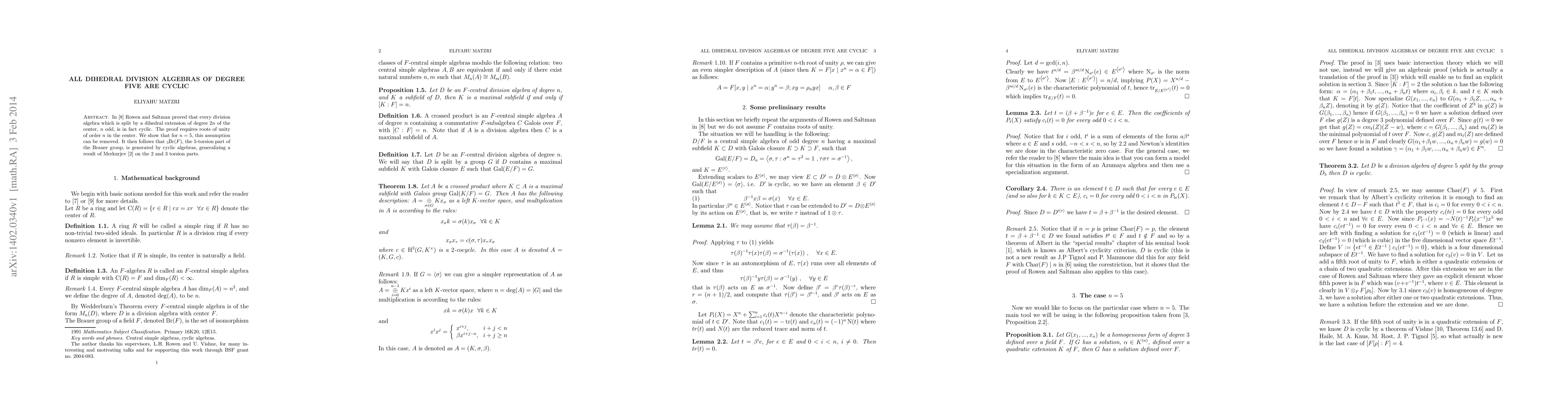 Rowen and Saltman proved that every division algebra which is split by a dihedral extension of degree $2n$ of the center, $n$ odd, is in fact cyclic. The proof requires roots of unity of order $n$ in the center. We show that for $n=5$, this assumption can be removed. It then follows that ${}_{5\!\!\!\:}Br(F)$, the $5$-torsion part of the Brauer group, is generated by cyclic algebras, generalizing a result of Merkurjev on the $2$ and $3$ torsion parts.